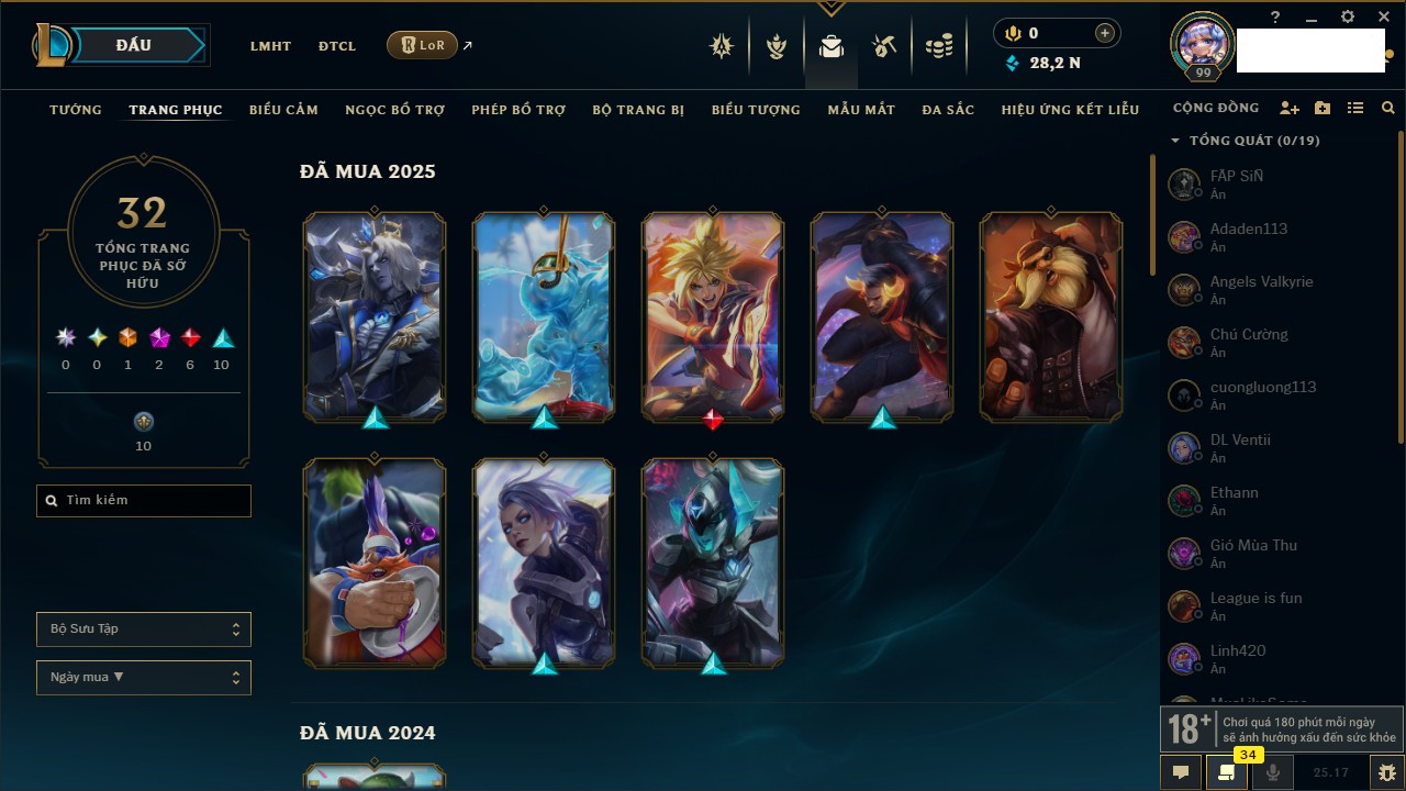 Rank Đơn: Vàng IVKhung: VàngTướng: 171 - Còn 56632 THXTrang Phục: 215Rank ĐTCL: Bạc ILinh Thú: 71