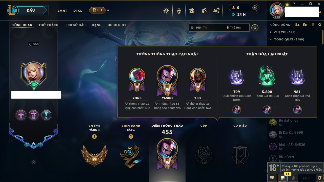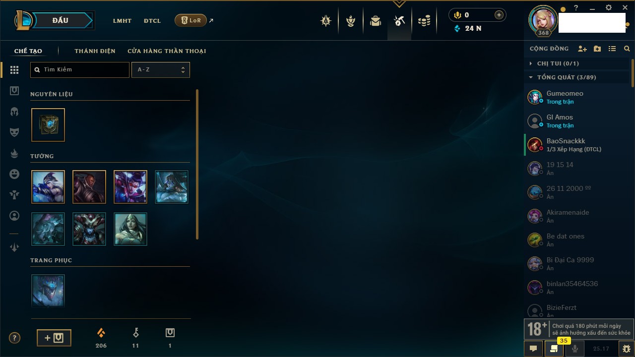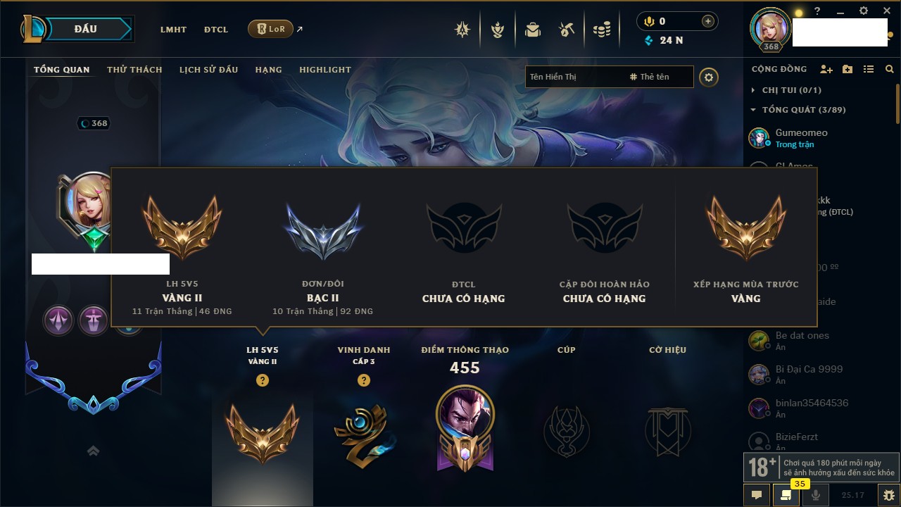 Rank Đơn: Sắt IVKhung: SắtTướng: 171 - Còn 231744 THXTrang Phục: 376Rank ĐTCL: Bạch Kim IILinh Thú: 120