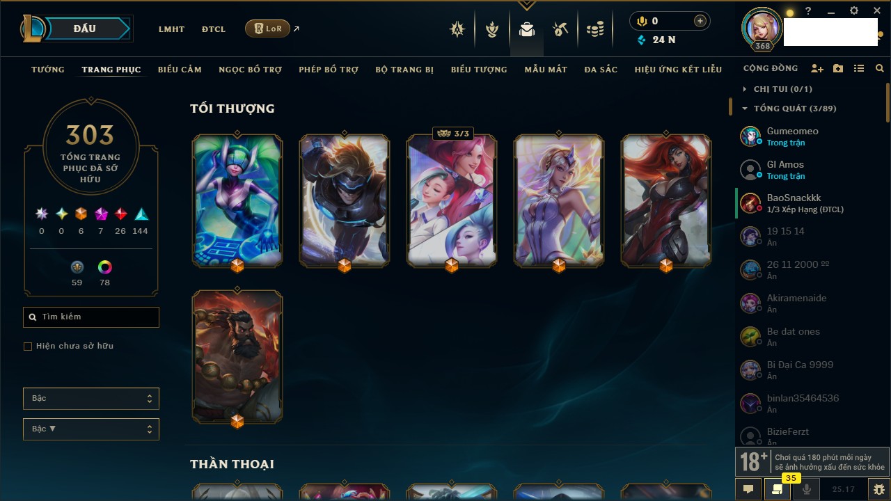 Rank Đơn: Bạc IIKhung: Bạch kimTướng: 169 - Còn 81813 THXTrang Phục: 301Rank ĐTCL: Chưa RankLinh Thú: 140