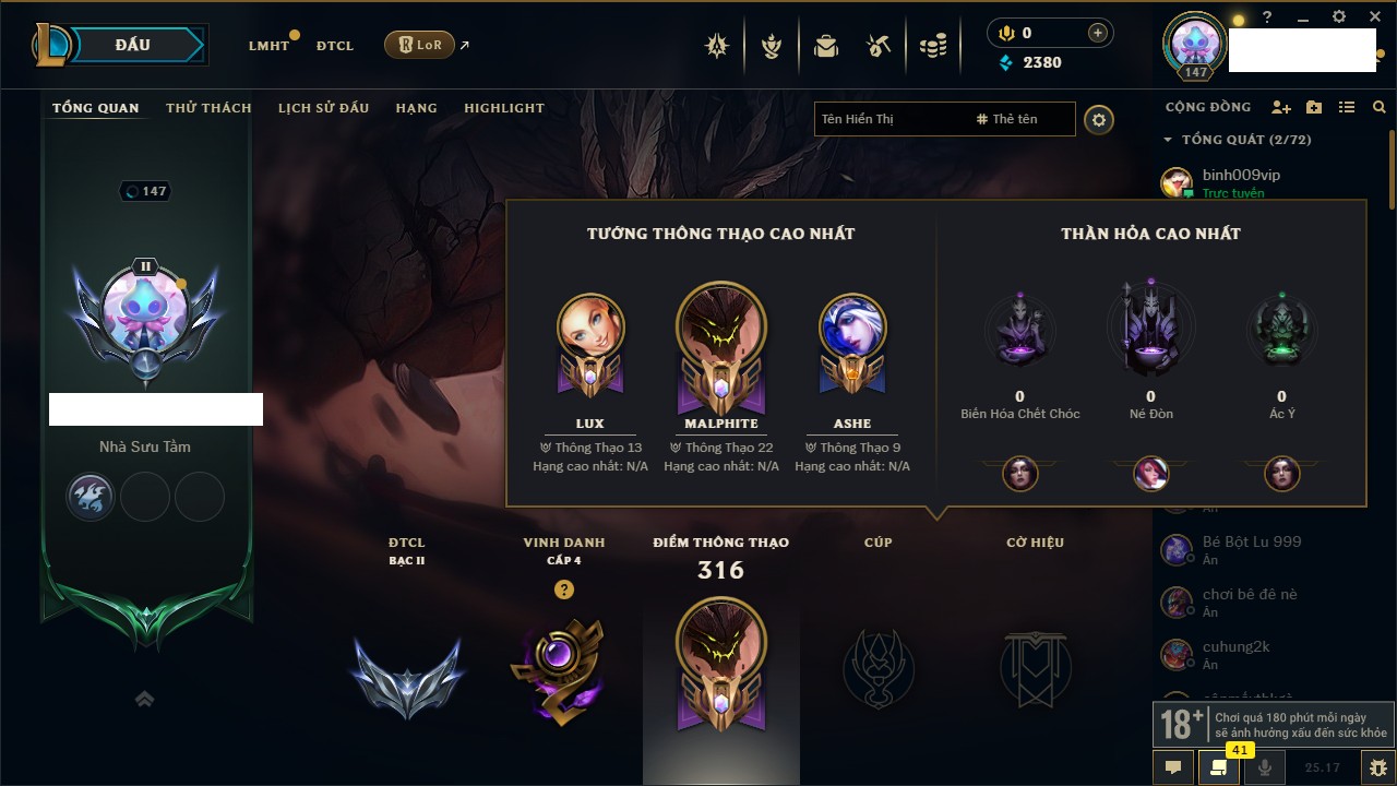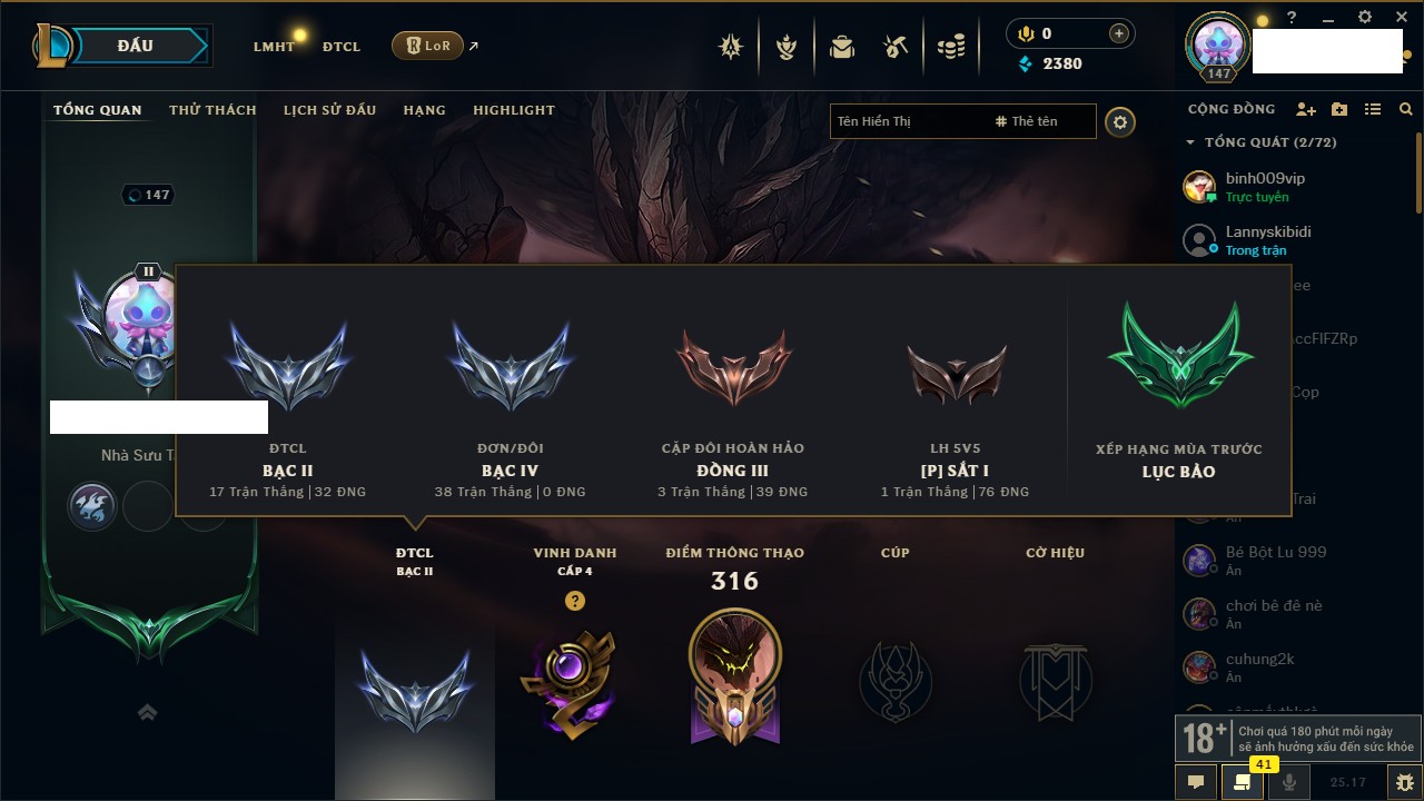 Rank Đơn: Đồng IIKhung: ĐồngTướng: 170 - Còn 66145 THXTrang Phục: 215Rank ĐTCL: Chưa RankLinh Thú: 52