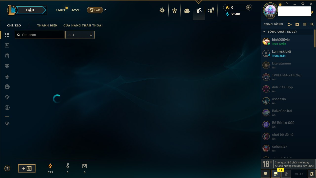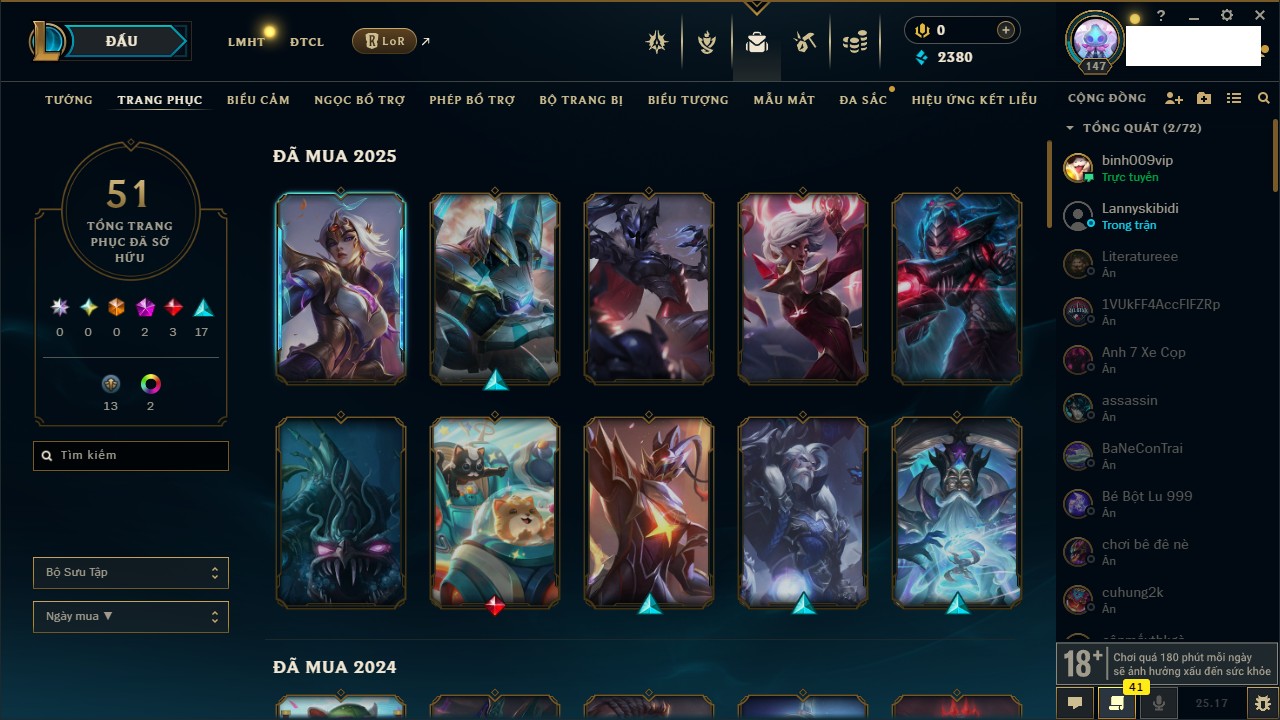Rank Đơn: Vàng IIIKhung: BạcTướng: 171 - Còn 101359 THXTrang Phục: 88Rank ĐTCL: Kim Cương IVLinh Thú: 200