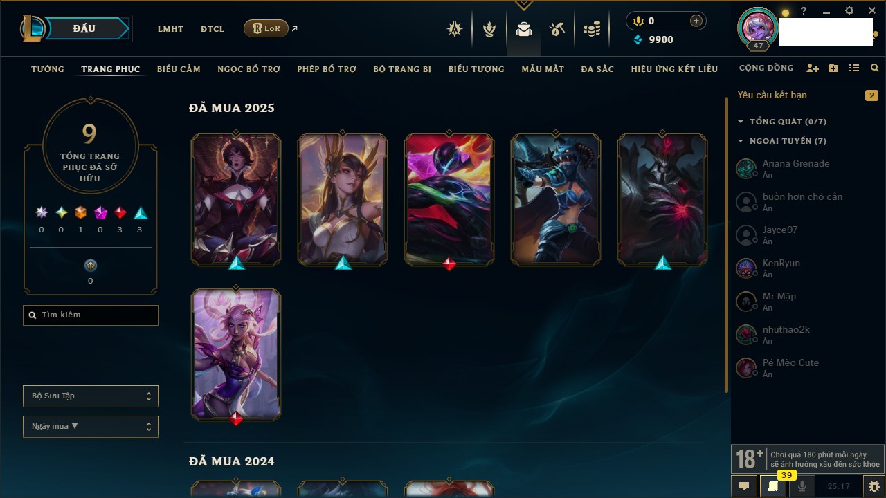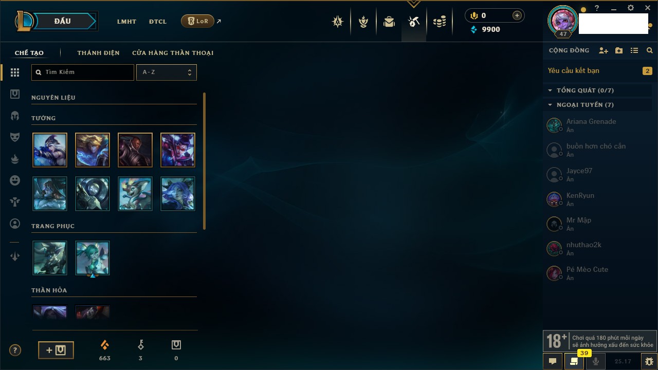 Rank Đơn: Bạc IIIKhung: BạcTướng: 171 - Còn 308470 THXTrang Phục: 164Rank ĐTCL: Chưa RankLinh Thú: 51