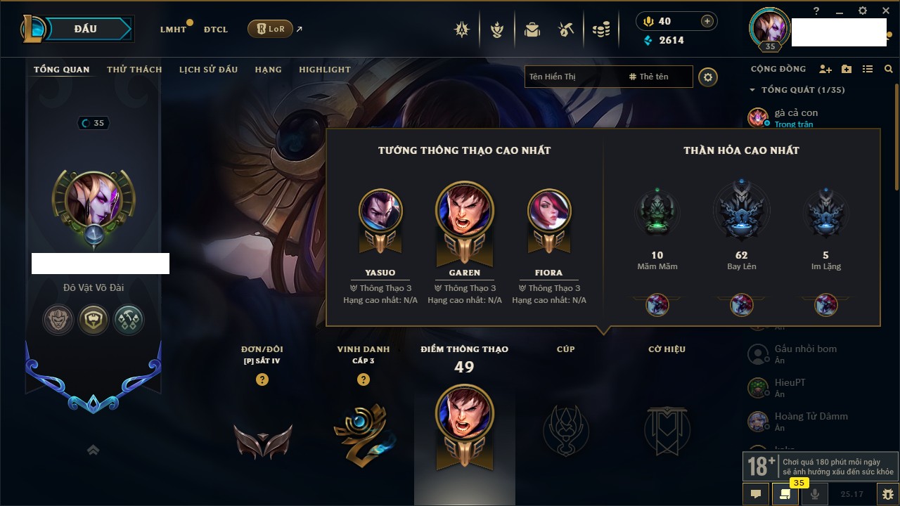 Rank Đơn: Bạch Kim IIIKhung: Bạch kimTướng: 170 - Còn 61079 THXTrang Phục: 352Rank ĐTCL: Sắt IILinh Thú: 70