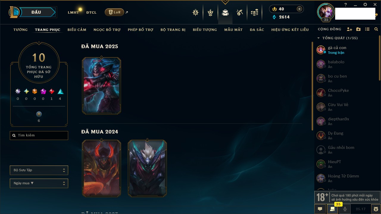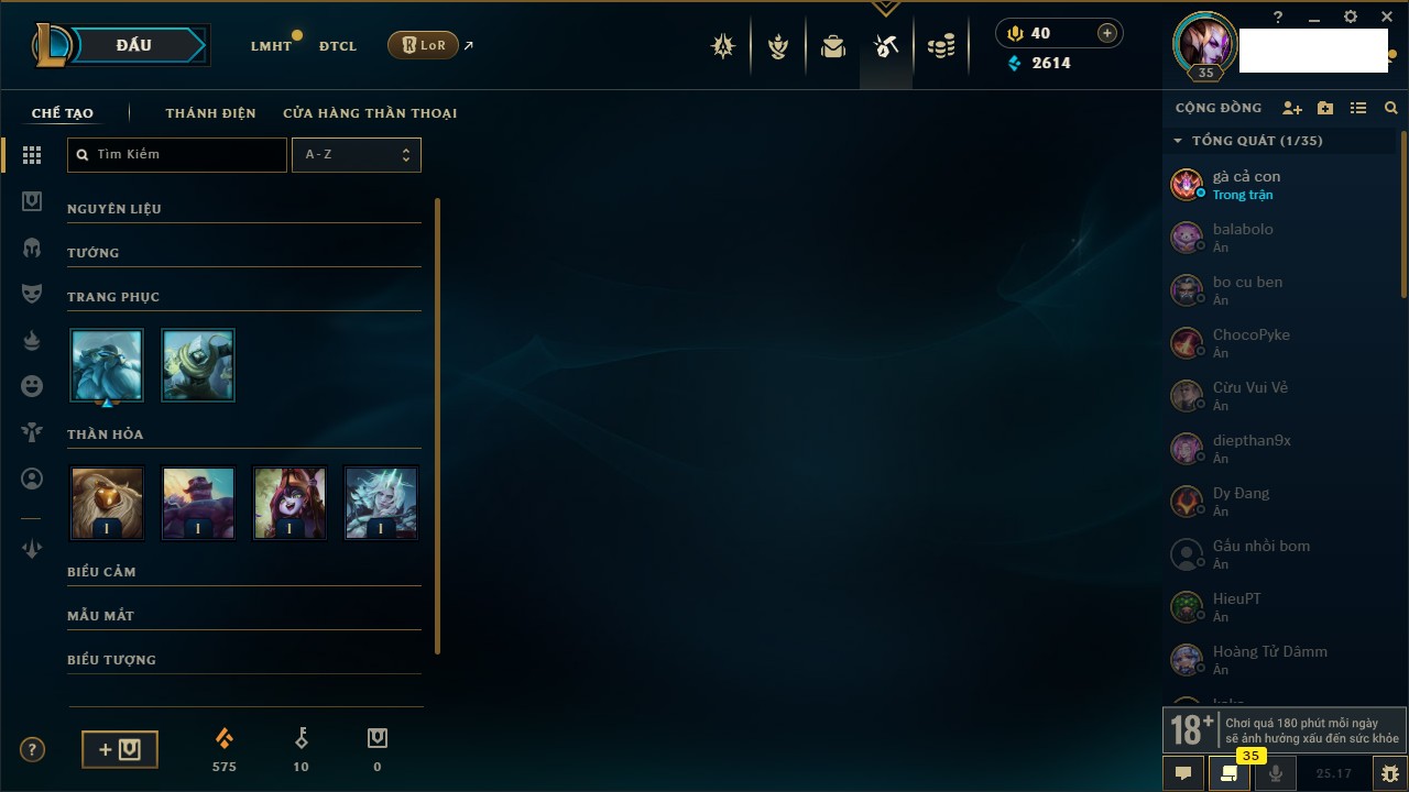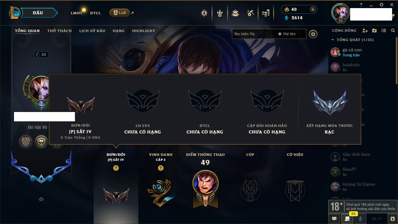 Rank Đơn: Vàng IKhung: Bạch kimTướng: 170 - Còn 212450 THXTrang Phục: 214Rank ĐTCL: Bạch Kim IVLinh Thú: 221