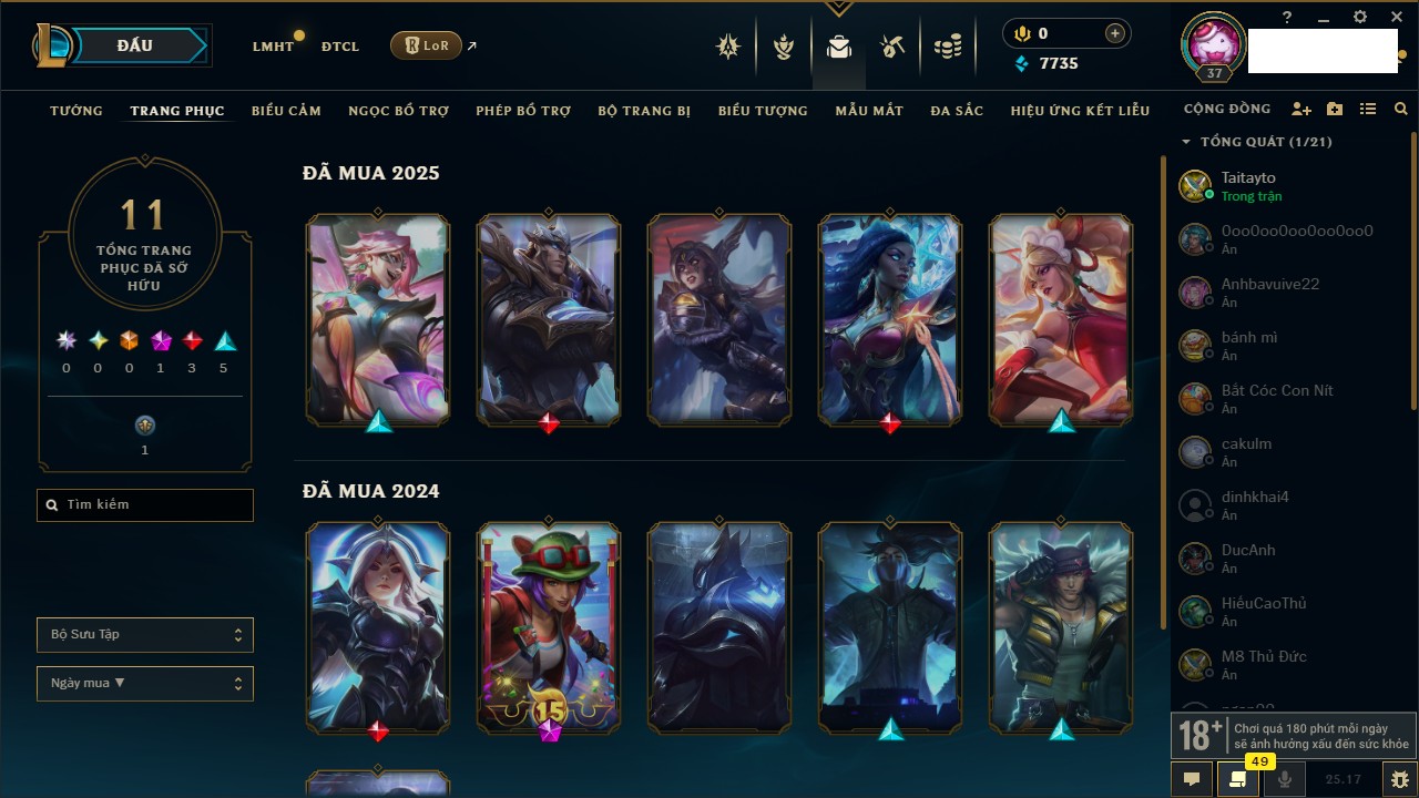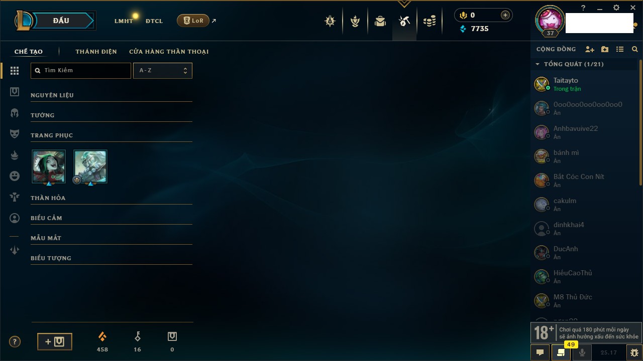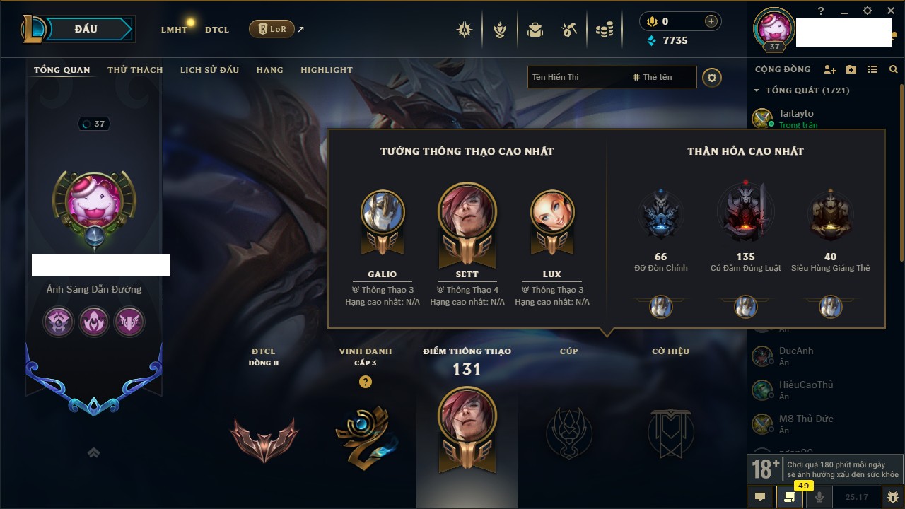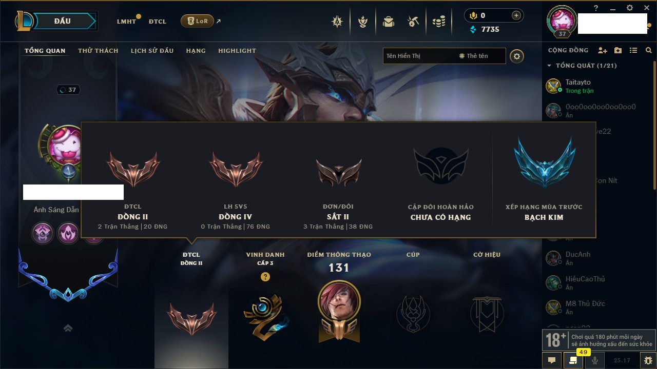 Rank Đơn: Vàng IKhung: Bạch kimTướng: 170 - Còn 212450 THXTrang Phục: 214Rank ĐTCL: Bạch Kim IVLinh Thú: 221