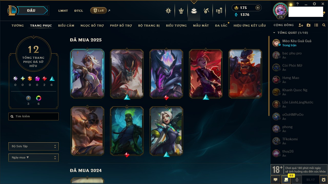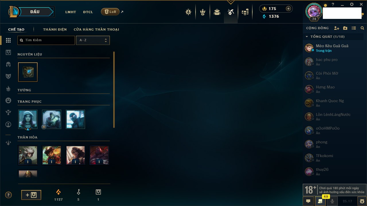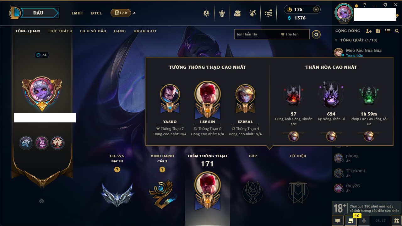 Rank Đơn: Sắt IIIKhung: Chưa có khungTướng: 49 - Còn 11000 THXTrang Phục: 6Rank ĐTCL: Chưa RankLinh Thú: 131