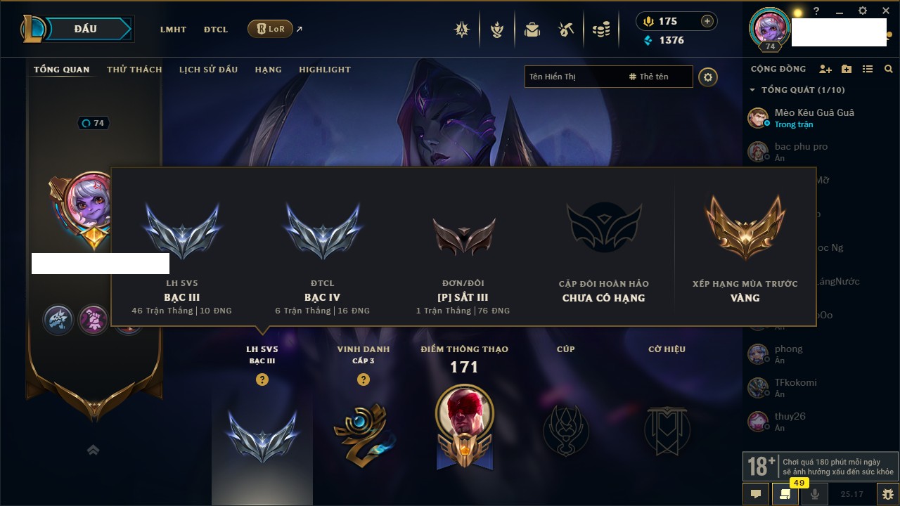 Rank Đơn: Đồng IIIKhung: Chưa có khungTướng: 86 - Còn 14367 THXTrang Phục: 19Rank ĐTCL: Vàng IIILinh Thú: 95