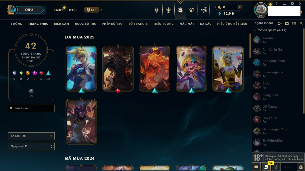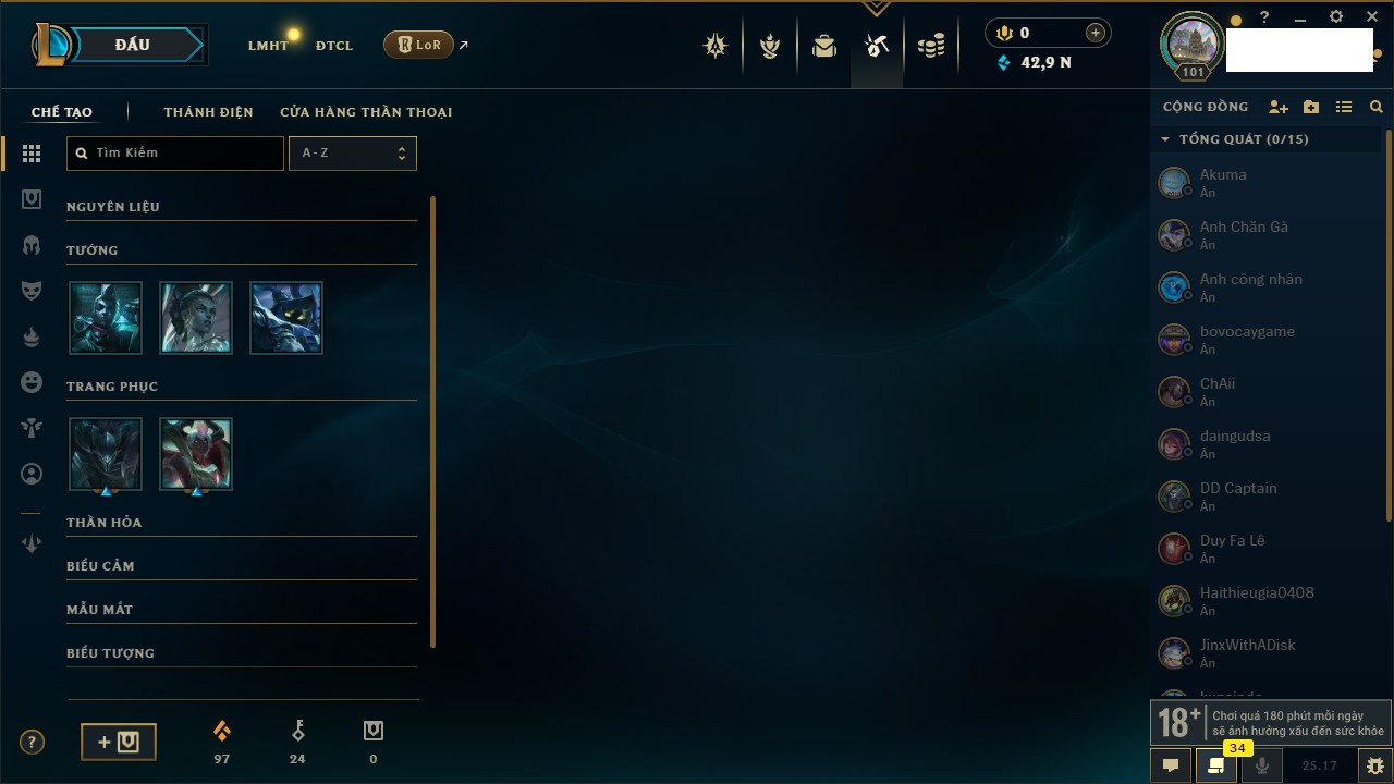 Rank Đơn: Chưa rank mùa nào Khung: Chưa có khung Tướng: 171 - Còn 42917 THX Trang Phục: 42 Rank ĐTCL: Chưa Rank Linh Thú: 160