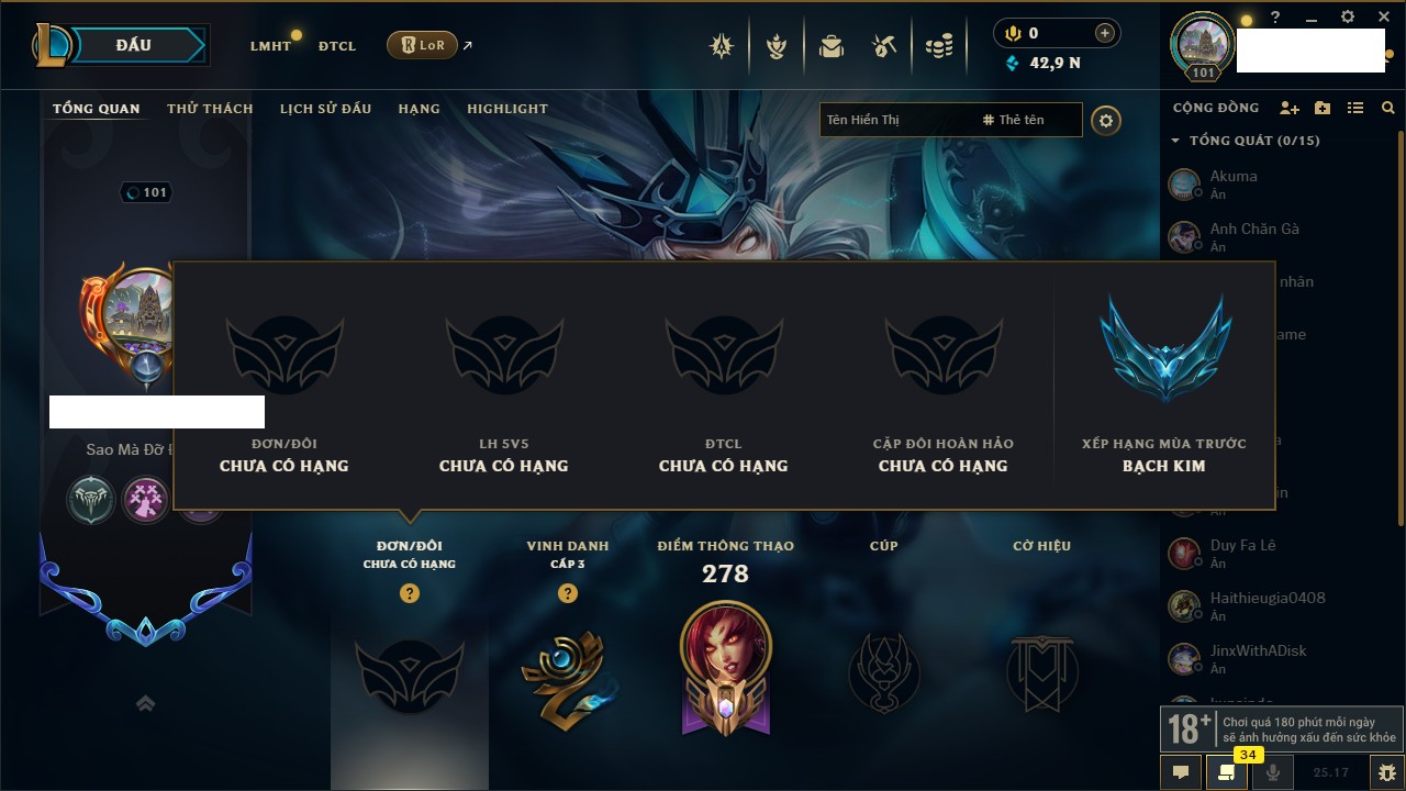 Rank Đơn: Bạch Kim IV Khung: Bạch kim Tướng: 170 - Còn 95523 THX Trang Phục: 243 Rank ĐTCL: Chưa Rank Linh Thú: 150