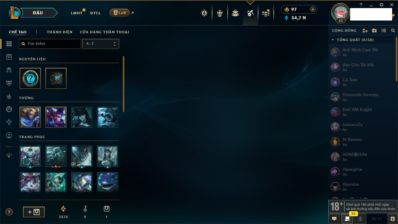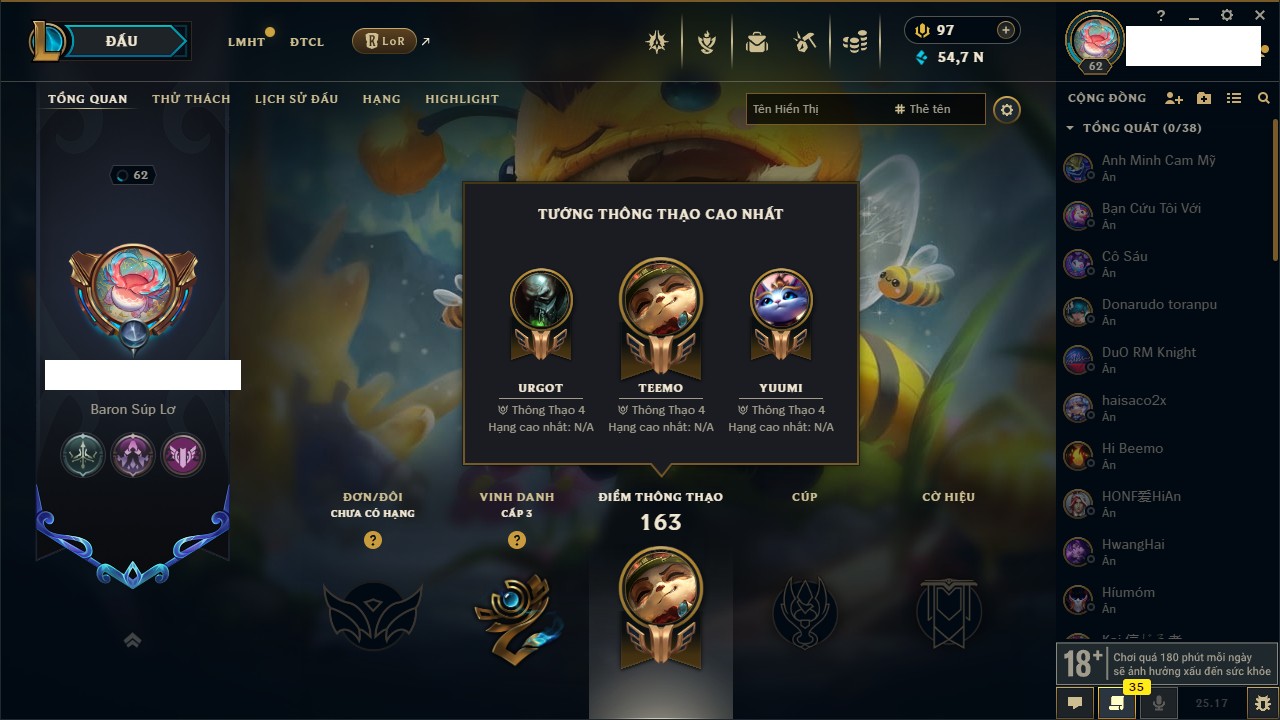 Rank Đơn: Vàng IKhung: BạcTướng: 171 - Còn 60584 THXTrang Phục: 286Rank ĐTCL: Vàng IIILinh Thú: 117