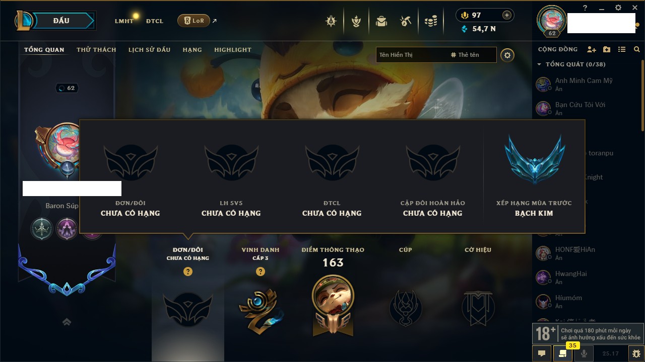 Rank Đơn: Bạch Kim IVKhung: Bạch kimTướng: 171 - Còn 54021 THXTrang Phục: 327Rank ĐTCL: Chưa RankLinh Thú: 115