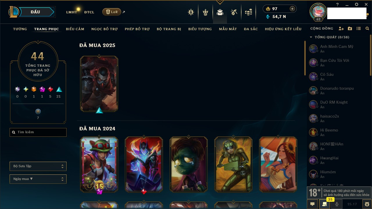 Rank Đơn: Vàng IIIKhung: VàngTướng: 171 - Còn 88128 THXTrang Phục: 329Rank ĐTCL: Chưa RankLinh Thú: 41