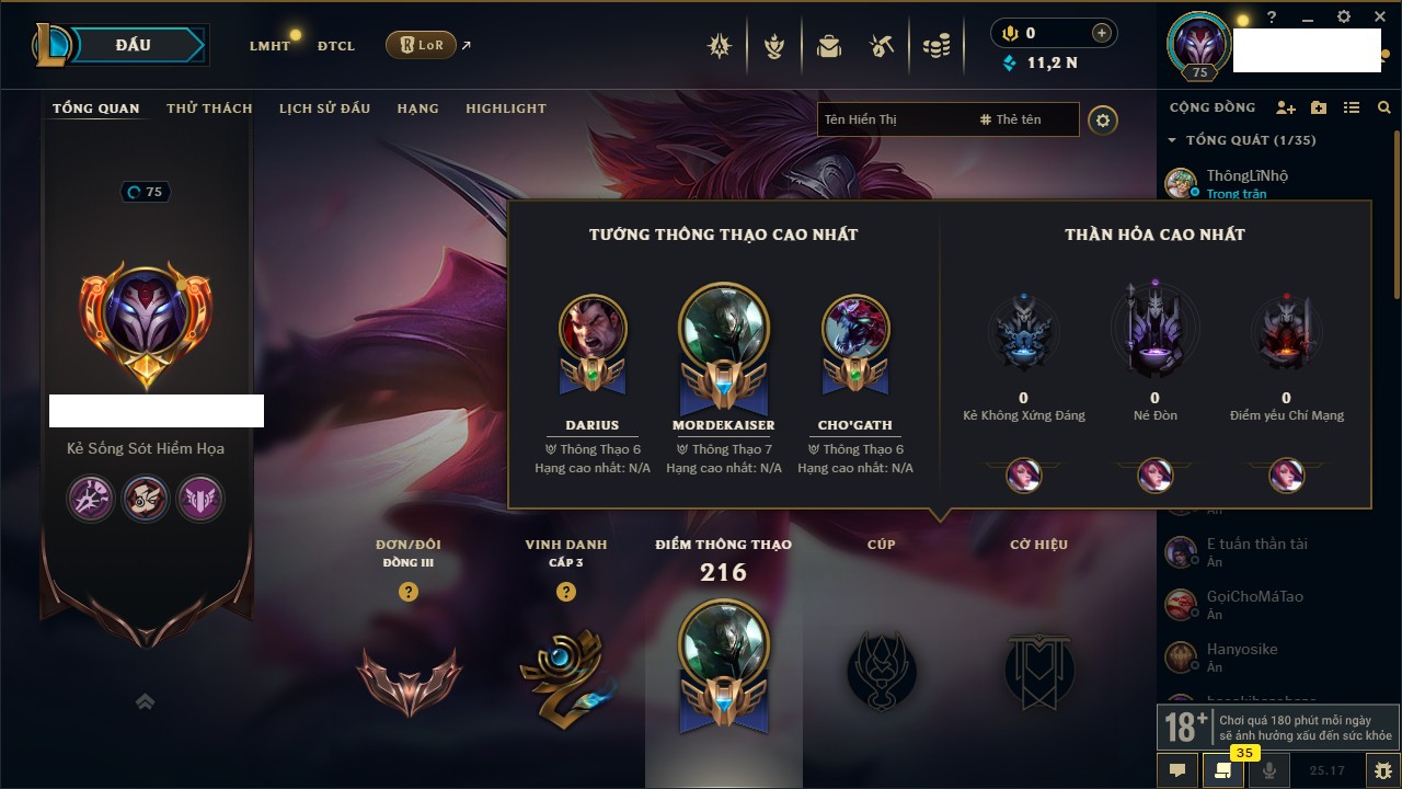 Rank Đơn: Chưa RankKhung: Chưa có khungTướng: 65 - Còn 2075 THXTrang Phục: 10Rank ĐTCL: Chưa RankLinh Thú: 72