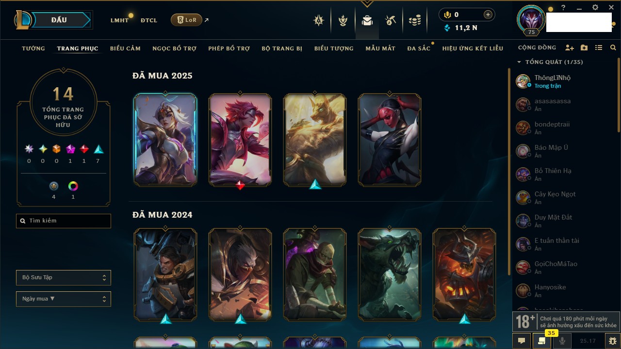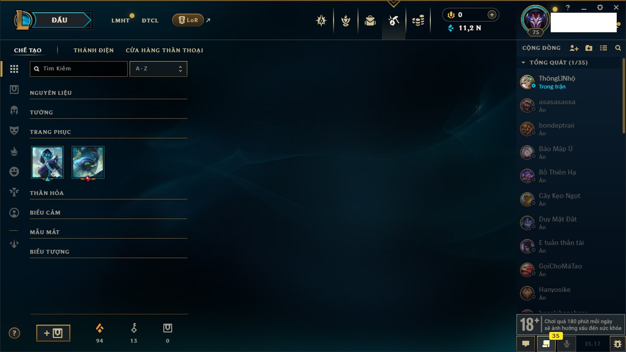 Rank Đơn: Chưa RankKhung: Chưa có khungTướng: 170 - Còn 13795 THXTrang Phục: 75Rank ĐTCL: Chưa RankLinh Thú: 176