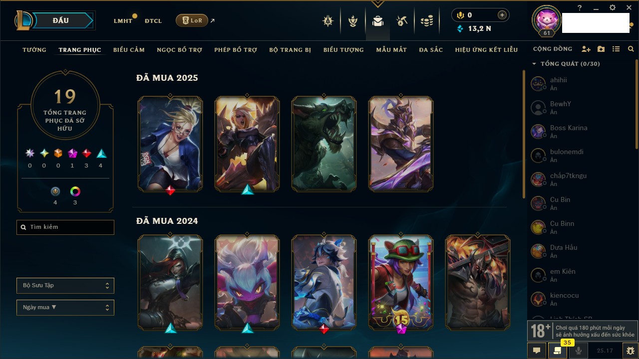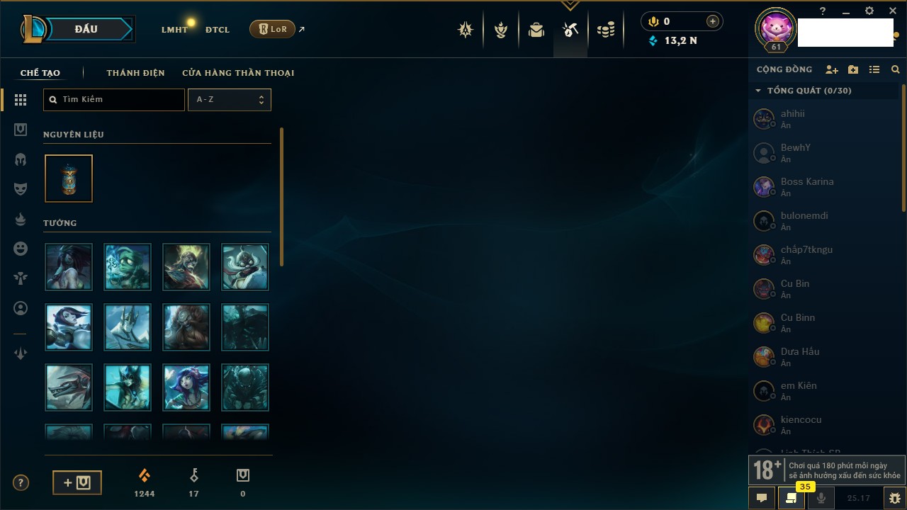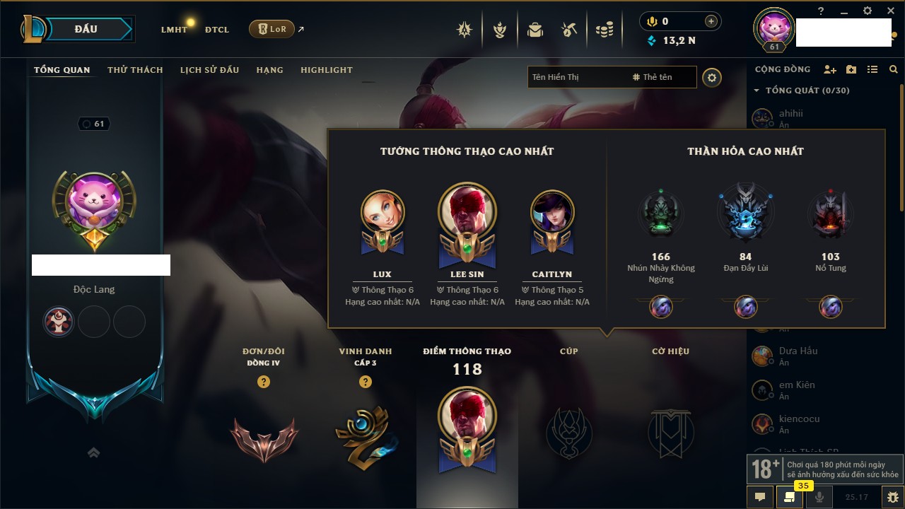Rank Đơn: Vàng IKhung: BạcTướng: 171 - Còn 60584 THXTrang Phục: 286Rank ĐTCL: Vàng IIILinh Thú: 117