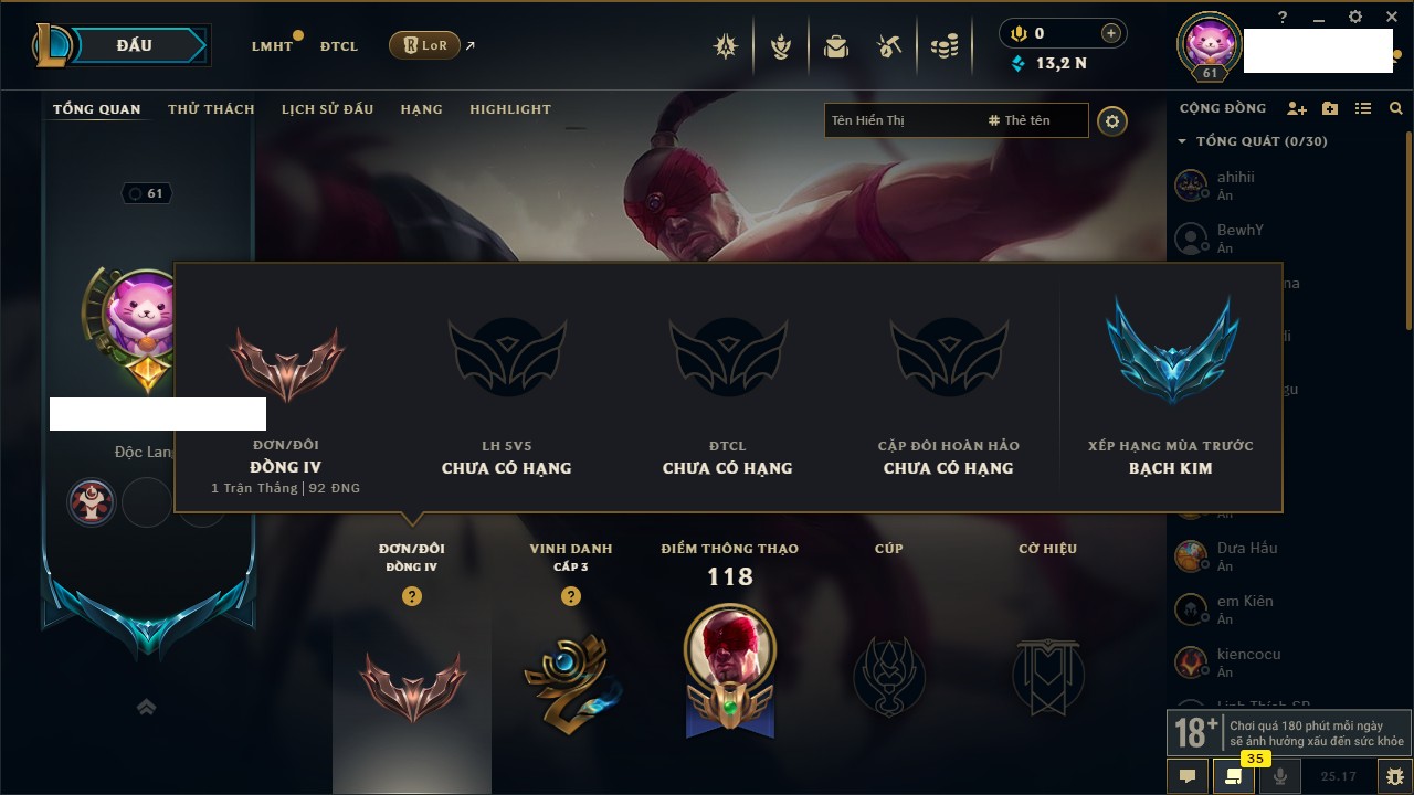 Rank Đơn: Bạch Kim IIKhung: Bạch kimTướng: 171 - Còn 141298 THXTrang Phục: 274Rank ĐTCL: Bạch Kim IILinh Thú: 188