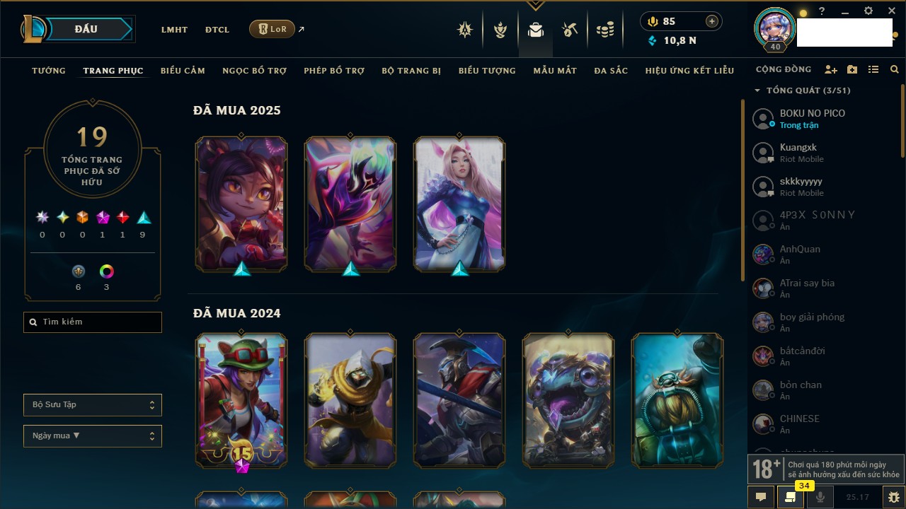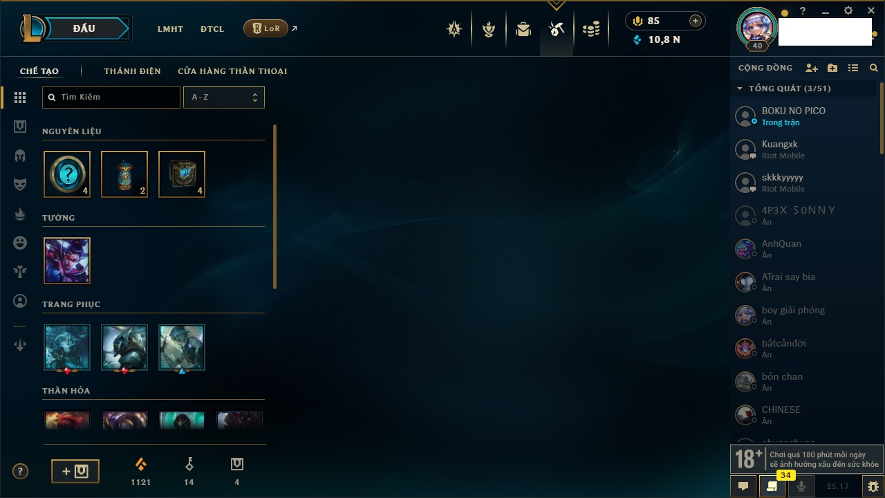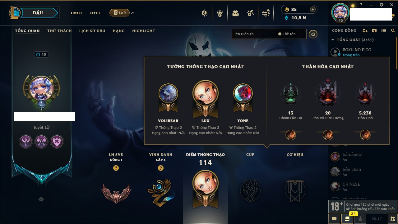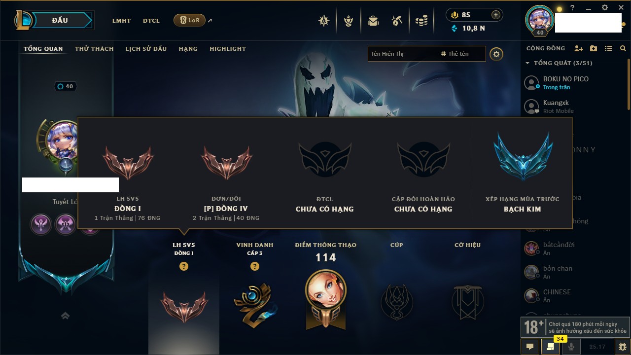 Rank Đơn: Đồng IVKhung: Chưa có khungTướng: 140 - Còn 10800 THXTrang Phục: 19Rank ĐTCL: Chưa RankLinh Thú: 119