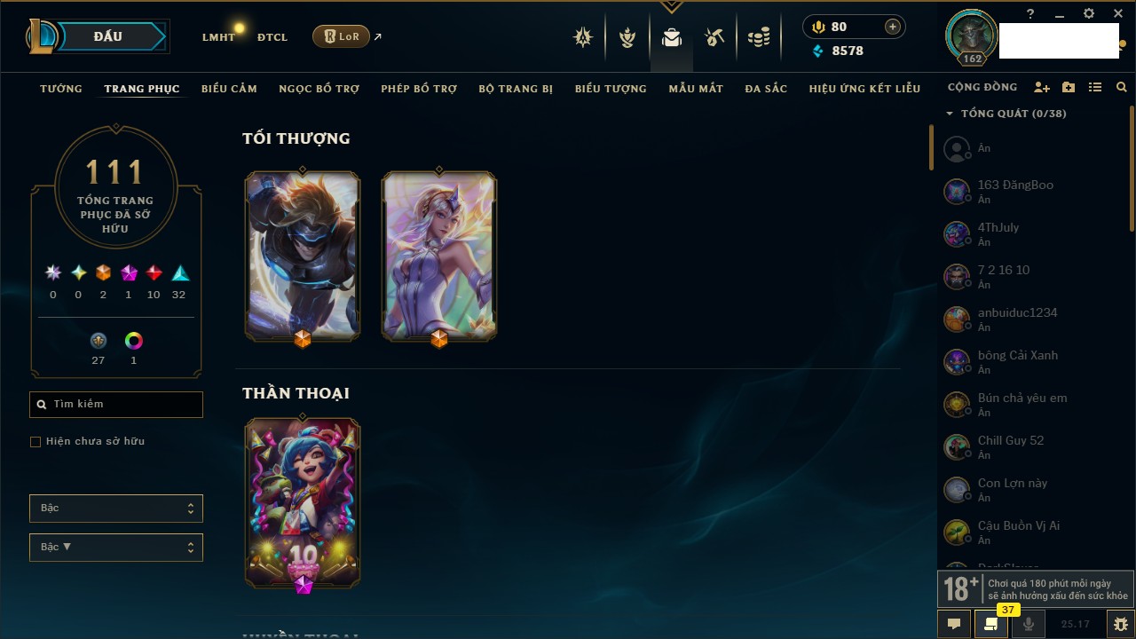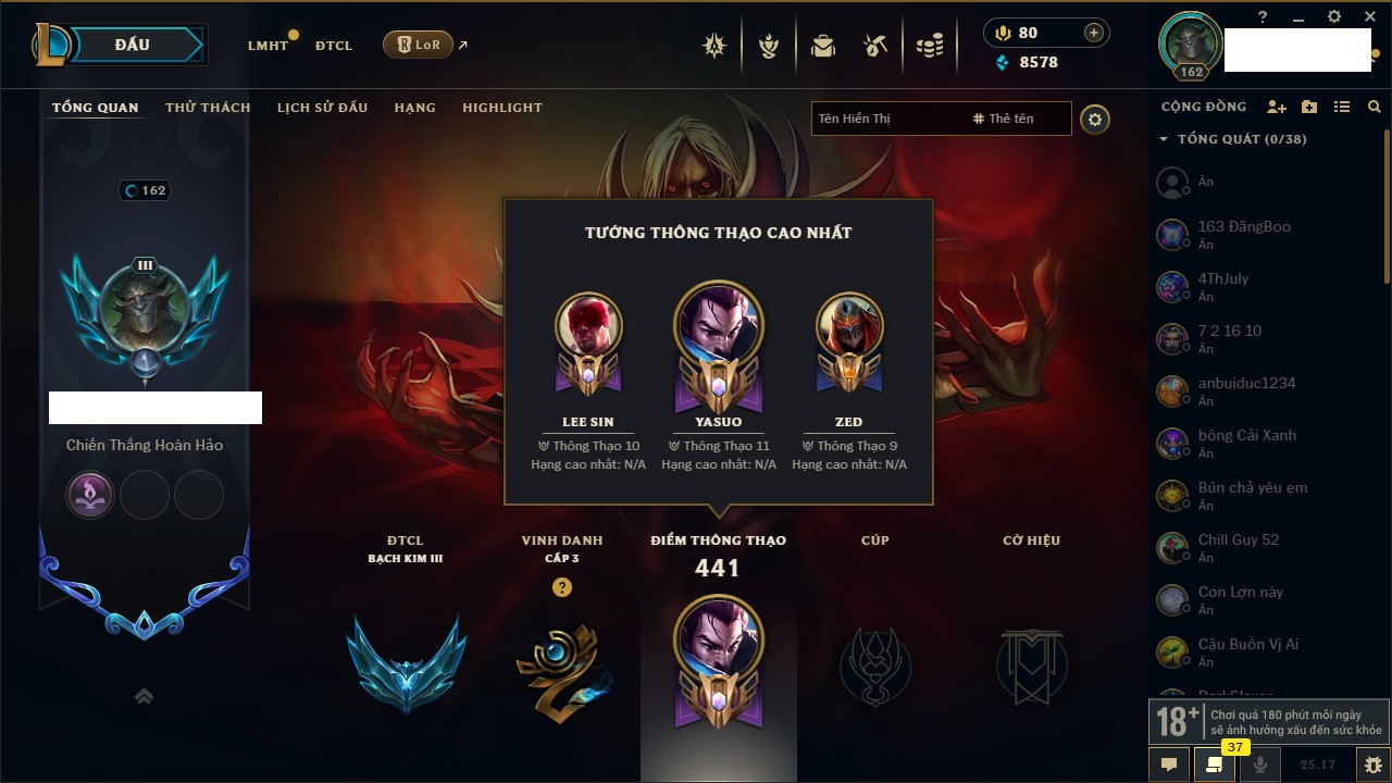 Rank Đơn: Bạc IIIKhung: Chưa có khungTướng: 171 - Còn 21493 THXTrang Phục: 252Rank ĐTCL: Bạch Kim IVLinh Thú: 123