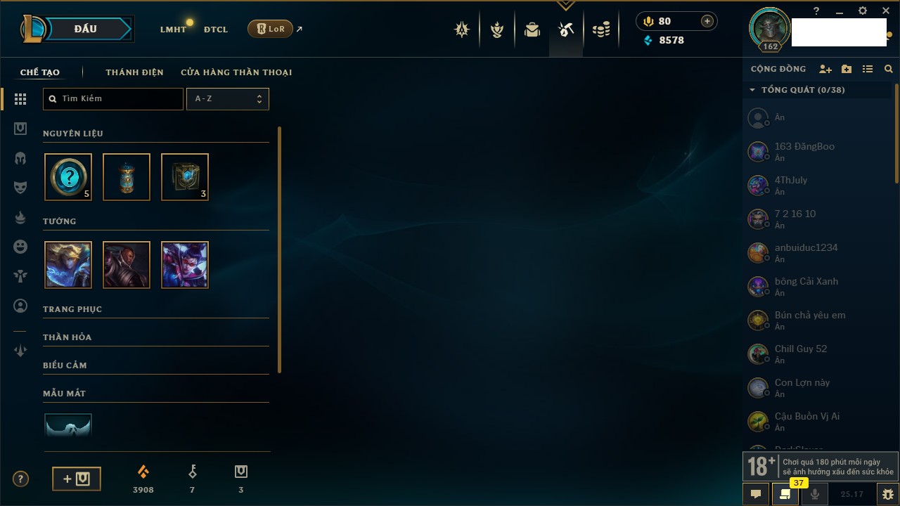 Rank Đơn: Vàng IIKhung: VàngTướng: 171 - Còn 34018 THXTrang Phục: 250Rank ĐTCL: Sắt IILinh Thú: 19