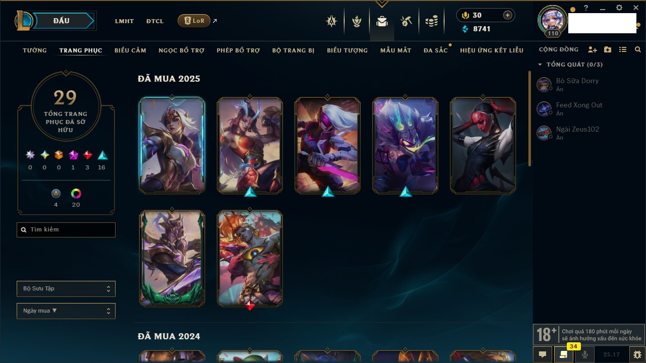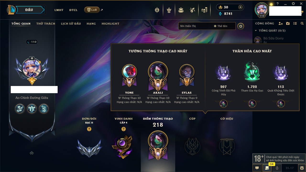 Rank Đơn: Chưa RankKhung: Chưa có khungTướng: 159 - Còn 7170 THXTrang Phục: 87Rank ĐTCL: Chưa RankLinh Thú: 25