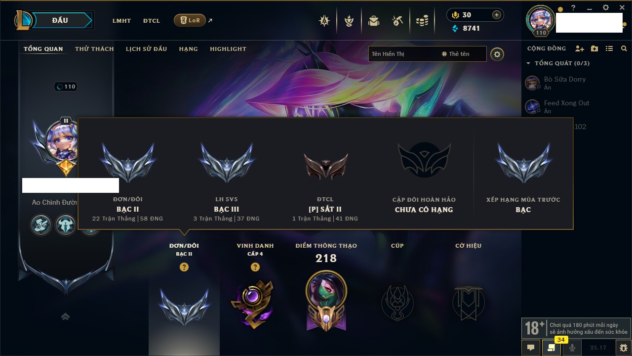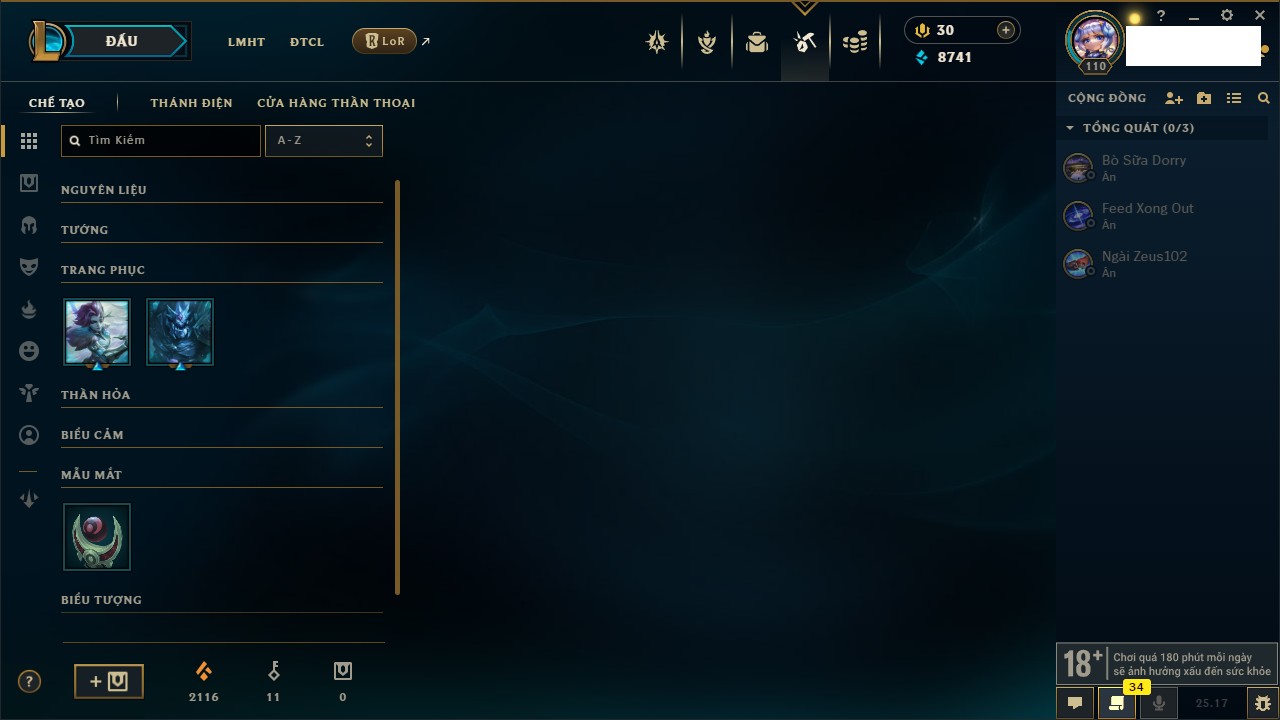 Rank Đơn: Đồng IKhung: Chưa có khungTướng: 171 - Còn 223932 THXTrang Phục: 61Rank ĐTCL: Lục Bảo ILinh Thú: 58