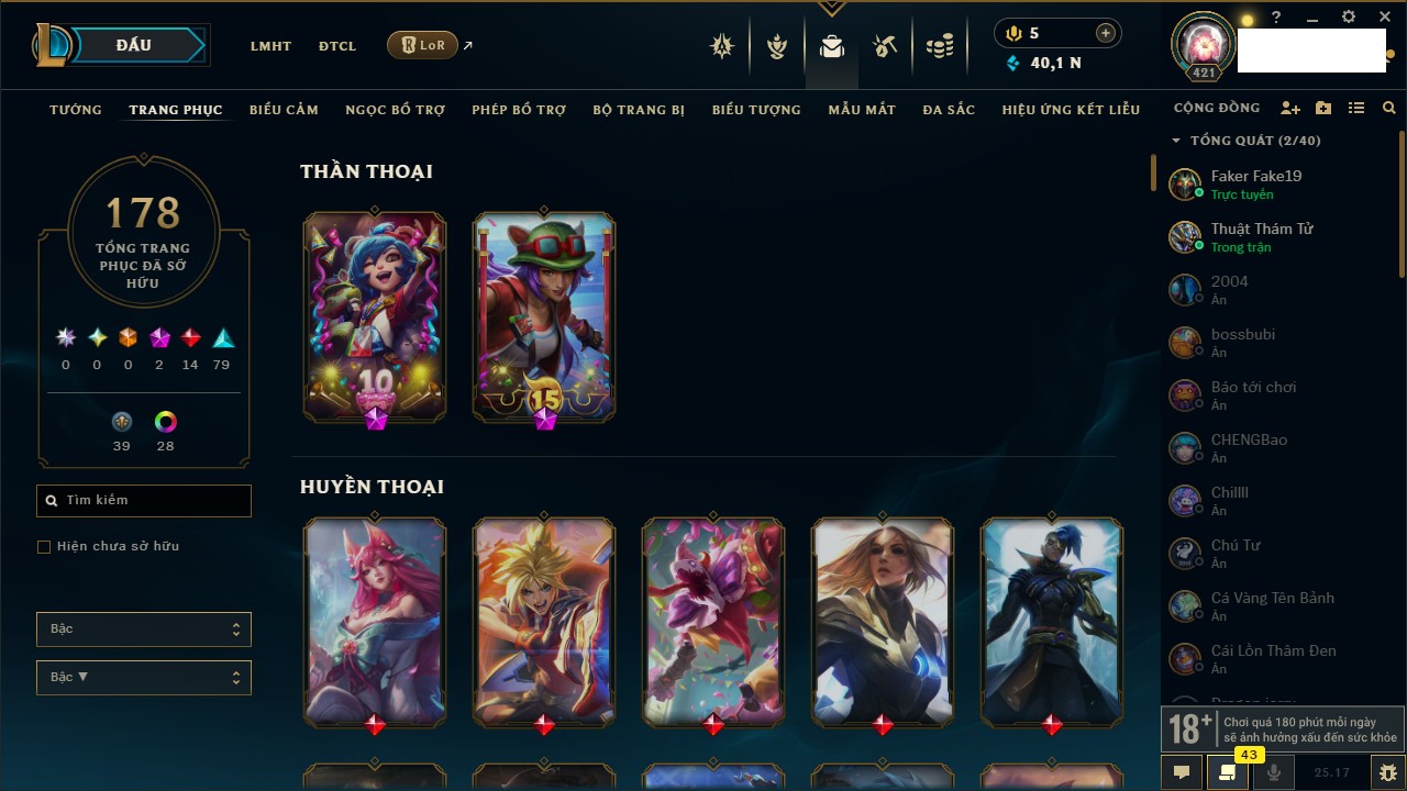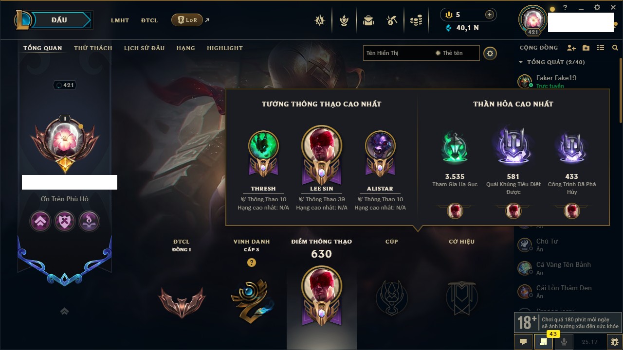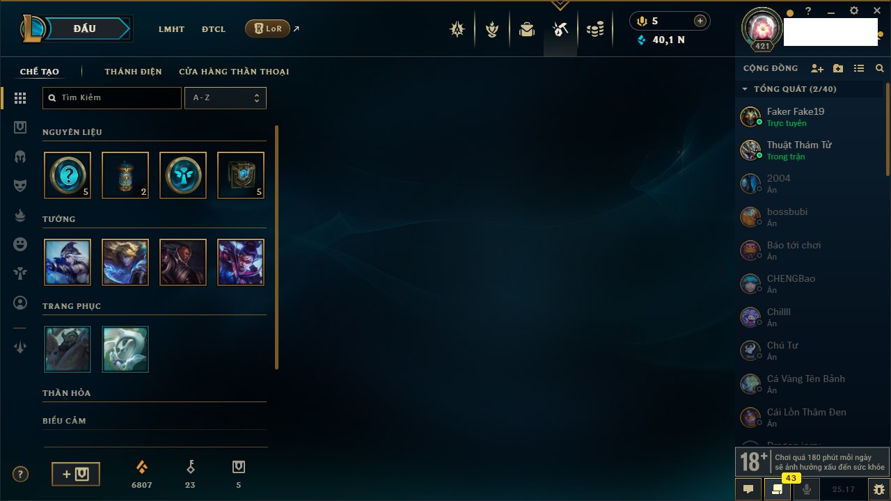 Rank Đơn: Chưa RankKhung: Bạch kimTướng: 171 - Còn 182788 THXTrang Phục: 158Rank ĐTCL: Chưa RankLinh Thú: 56