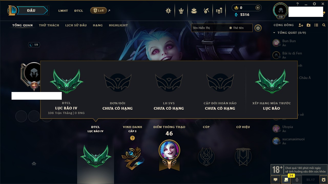 Rank Đơn: Chưa rank mùa nàoKhung: Chưa có khungTướng: 66 - Còn 2316 THXTrang Phục: 5Rank ĐTCL: Lục Bảo IVLinh Thú: 104