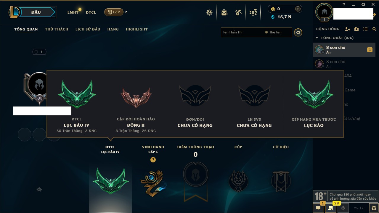 Rank Đơn: Lục Bảo IVKhung: Bạch kimTướng: 171 - Còn 128452 THXTrang Phục: 193Rank ĐTCL: Bạc IIILinh Thú: 100