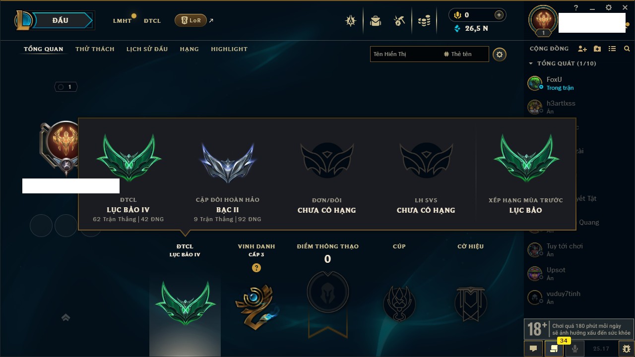 Rank Đơn: Bạc IIIKhung: BạcTướng: 168 - Còn 101710 THXTrang Phục: 184Rank ĐTCL: Chưa RankLinh Thú: 17