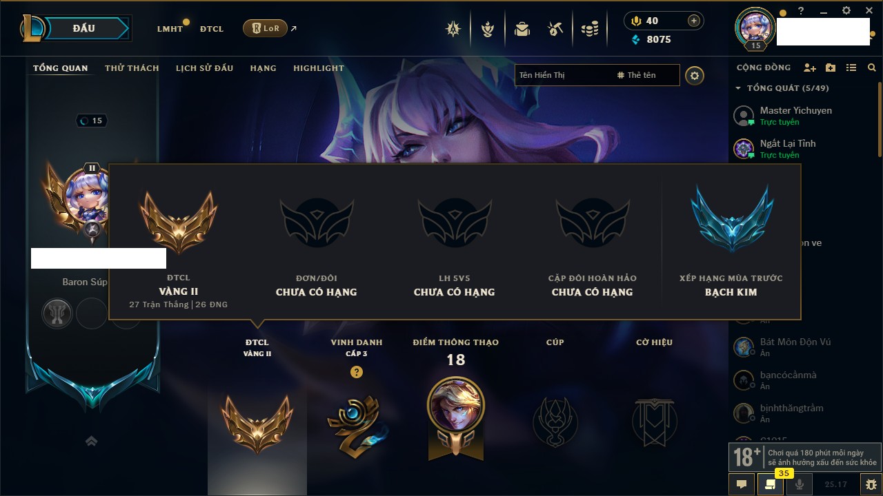Rank Đơn: Bạc IIIKhung: Chưa có khungTướng: 171 - Còn 21493 THXTrang Phục: 252Rank ĐTCL: Bạch Kim IVLinh Thú: 123