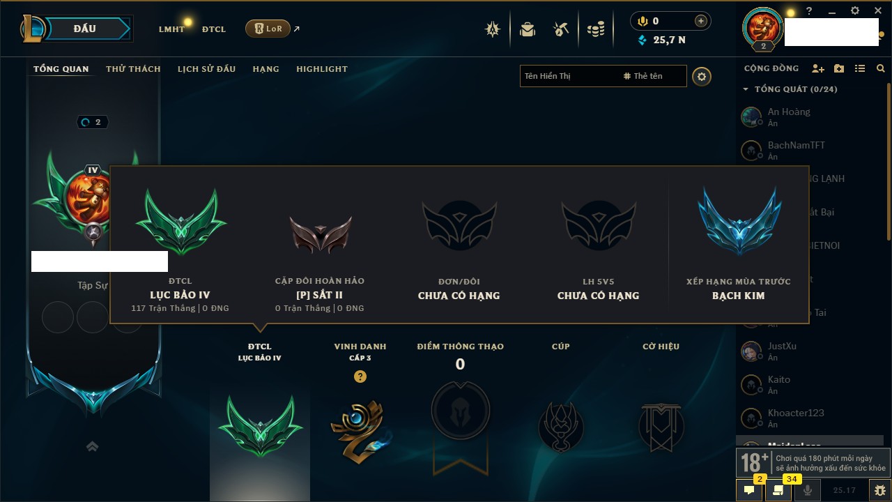 Rank Đơn: Chưa rank mùa nàoKhung: Chưa có khungTướng: 7 - Còn 24800 THXTrang Phục: 0Rank ĐTCL: Bạch Kim IVLinh Thú: 19