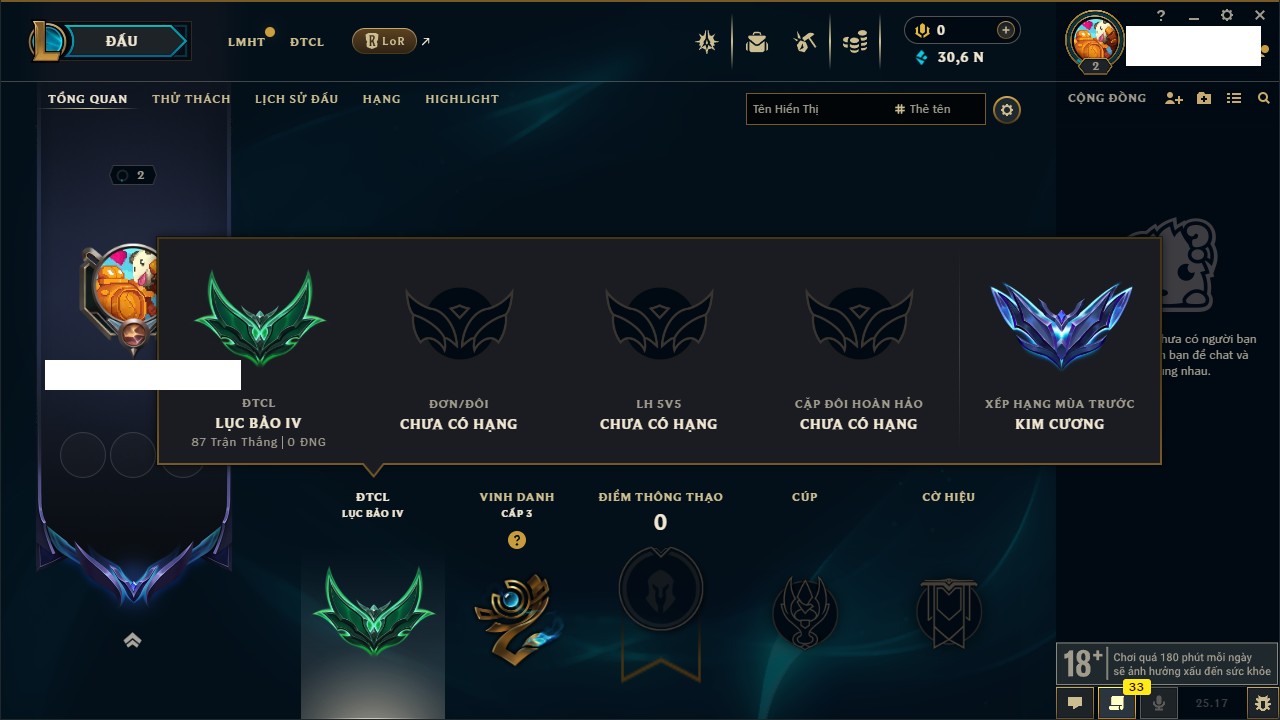 Rank Đơn: Bạch Kim IVKhung: VàngTướng: 171 - Còn 130280 THXTrang Phục: 226Rank ĐTCL: Kim Cương IVLinh Thú: 183