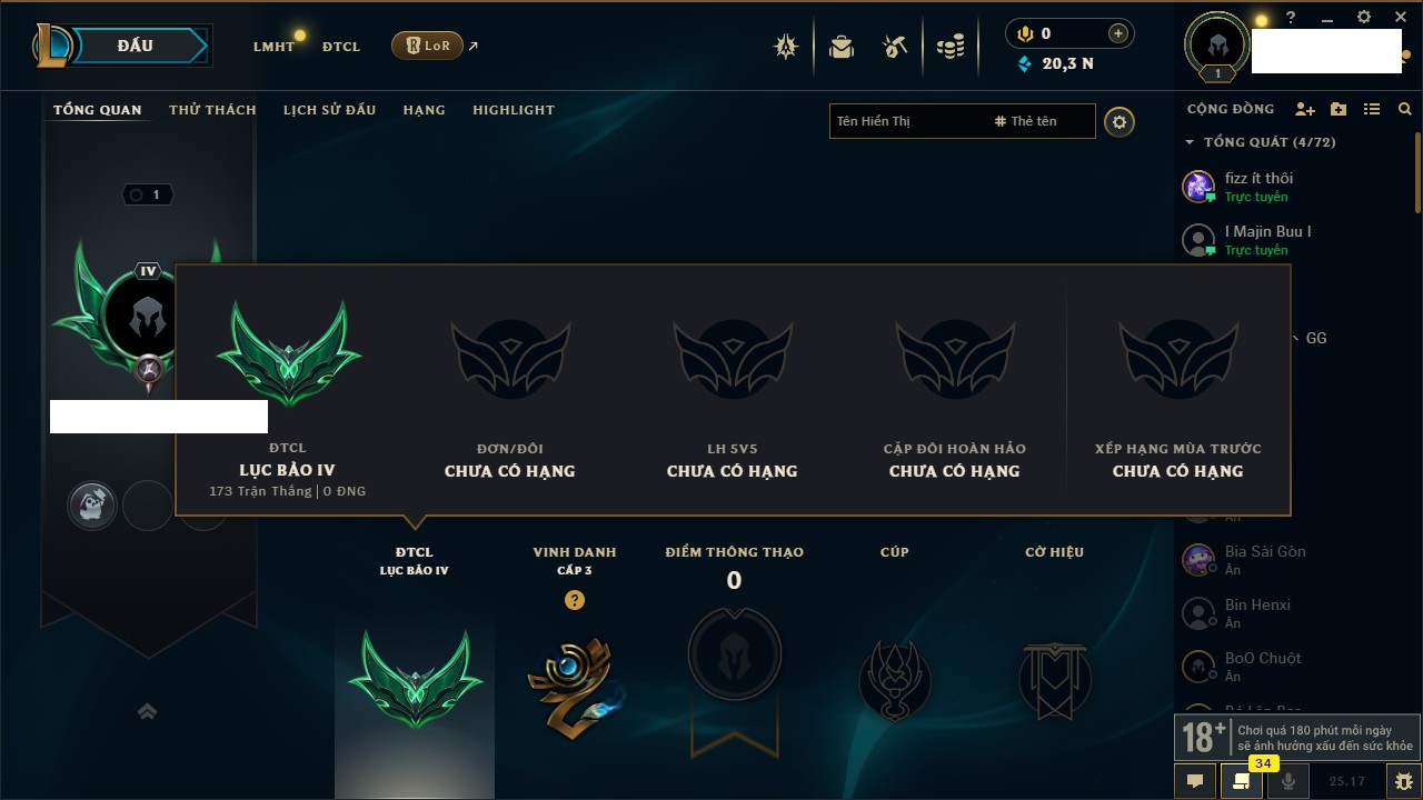 Rank Đơn: Vàng IIIKhung: BạcTướng: 171 - Còn 101359 THXTrang Phục: 88Rank ĐTCL: Kim Cương IVLinh Thú: 200