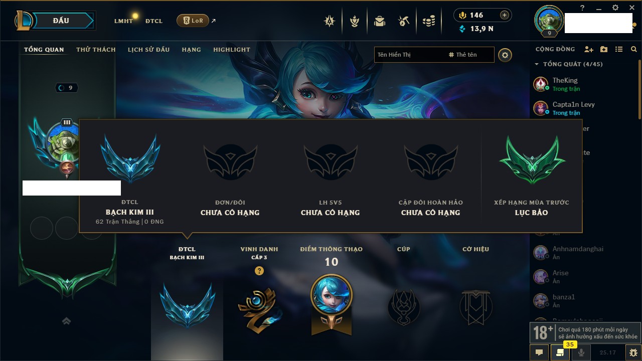 Rank Đơn: Lục Bảo IVKhung: VàngTướng: 171 - Còn 154648 THXTrang Phục: 203Rank ĐTCL: Bạch Kim IVLinh Thú: 69