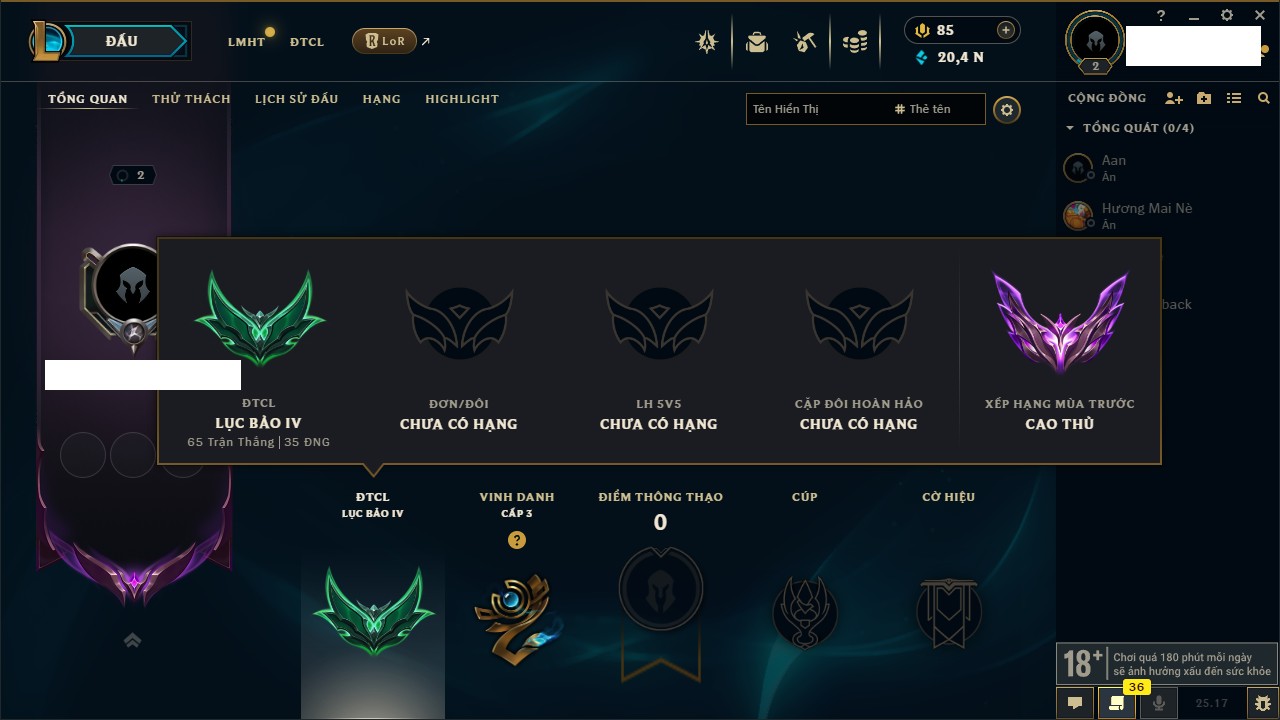 Rank Đơn: Chưa rank mùa nàoKhung: Chưa có khungTướng: 7 - Còn 24800 THXTrang Phục: 0Rank ĐTCL: Bạch Kim IVLinh Thú: 19