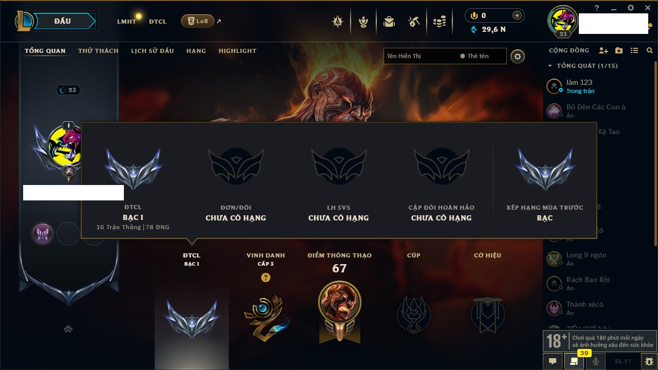 Rank Đơn: Bạc IIIKhung: BạcTướng: 171 - Còn 190352 THXTrang Phục: 260Rank ĐTCL: Sắt IILinh Thú: 31