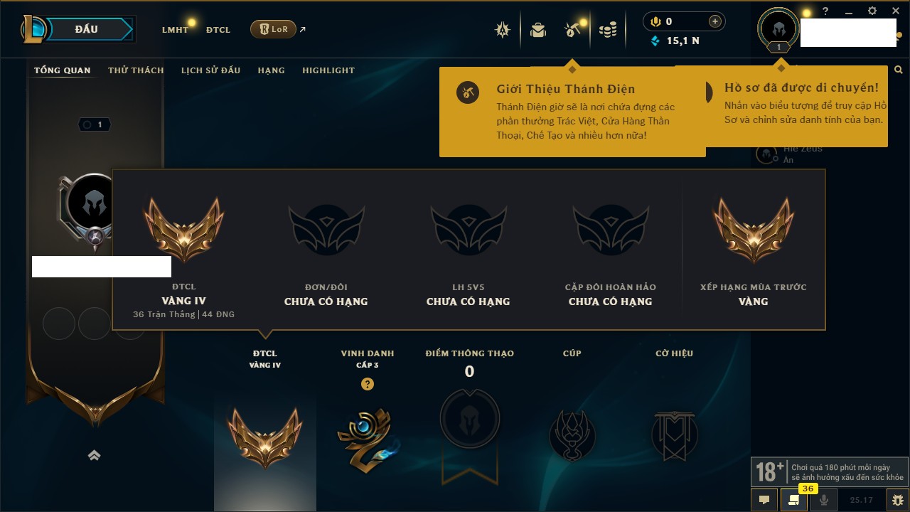 Rank Đơn: Vàng IIIKhung: BạcTướng: 171 - Còn 101359 THXTrang Phục: 88Rank ĐTCL: Kim Cương IVLinh Thú: 200