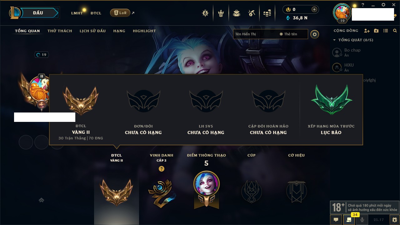 Rank Đơn: Chưa rank mùa nàoKhung: Chưa có khungTướng: 1 - Còn 9000 THXTrang Phục: 0Rank ĐTCL: Bạch Kim IIILinh Thú: 14