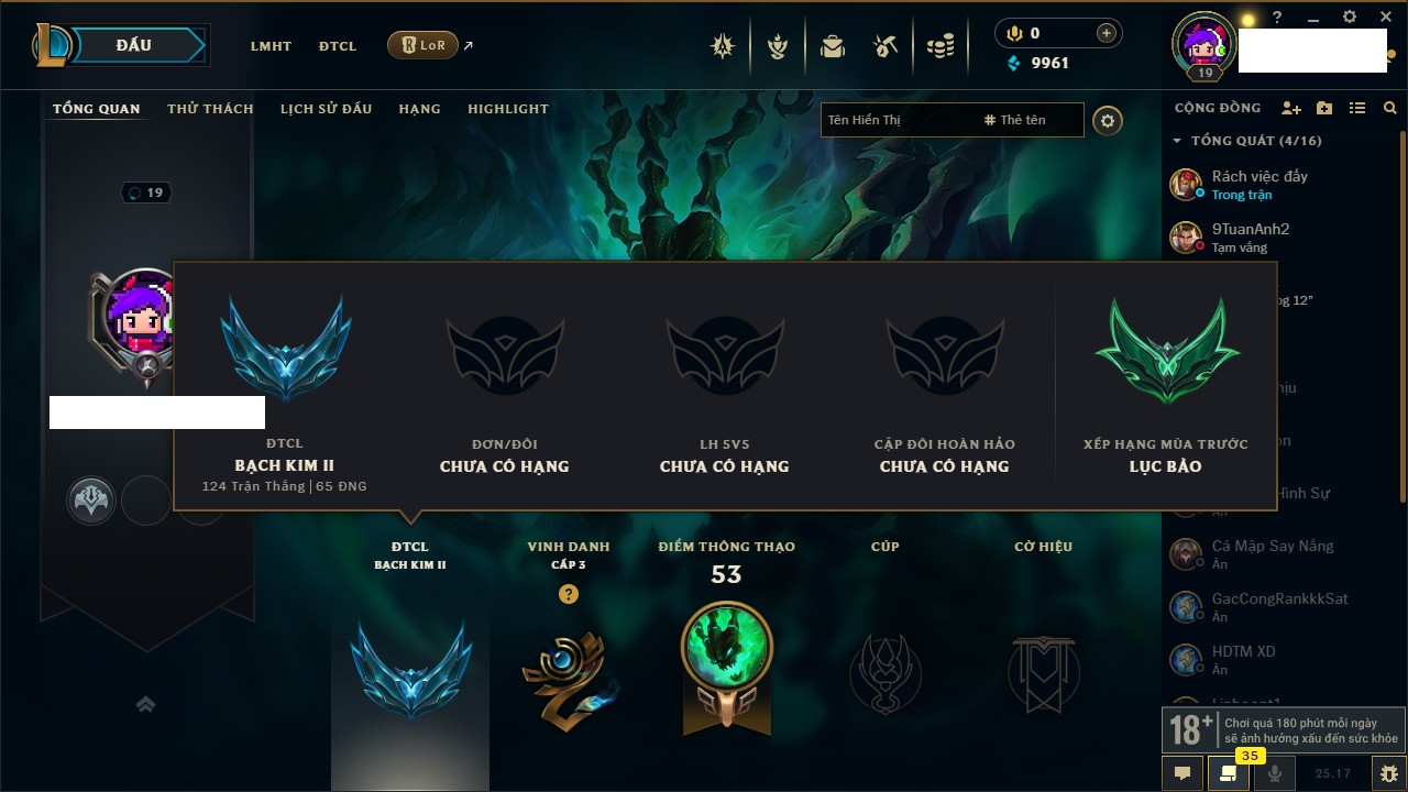 Rank Đơn: Chưa rank mùa nàoKhung: Chưa có khungTướng: 1 - Còn 9000 THXTrang Phục: 0Rank ĐTCL: Bạch Kim IIILinh Thú: 14