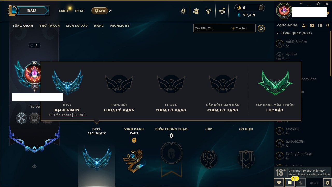 Rank Đơn: Lục Bảo IVKhung: Bạch kimTướng: 171 - Còn 128452 THXTrang Phục: 193Rank ĐTCL: Bạc IIILinh Thú: 100
