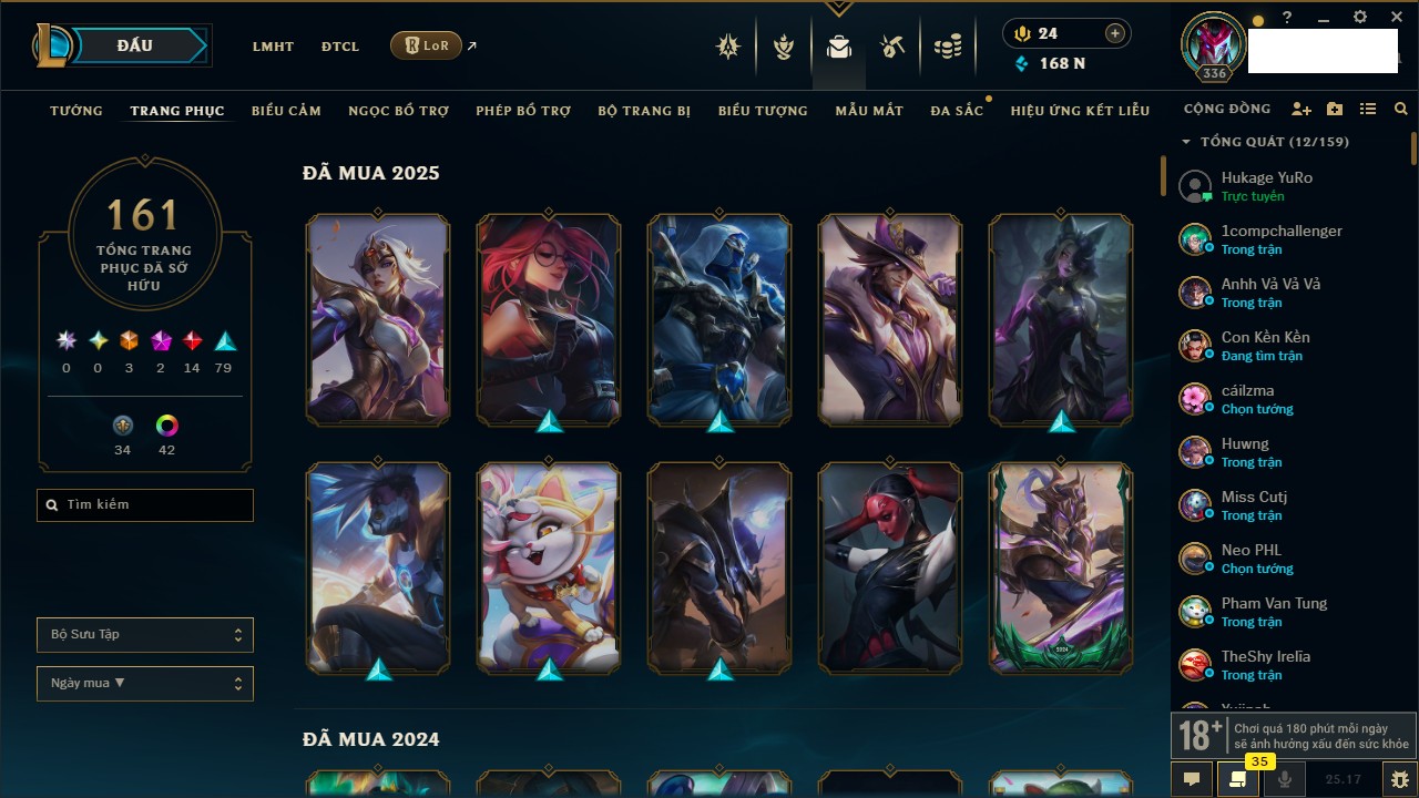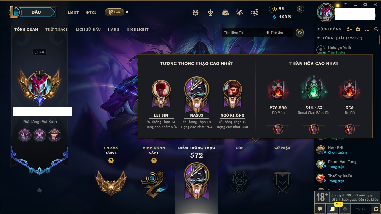 Rank Đơn: Bạc IIKhung: Bạch kimTướng: 169 - Còn 81813 THXTrang Phục: 301Rank ĐTCL: Chưa RankLinh Thú: 140