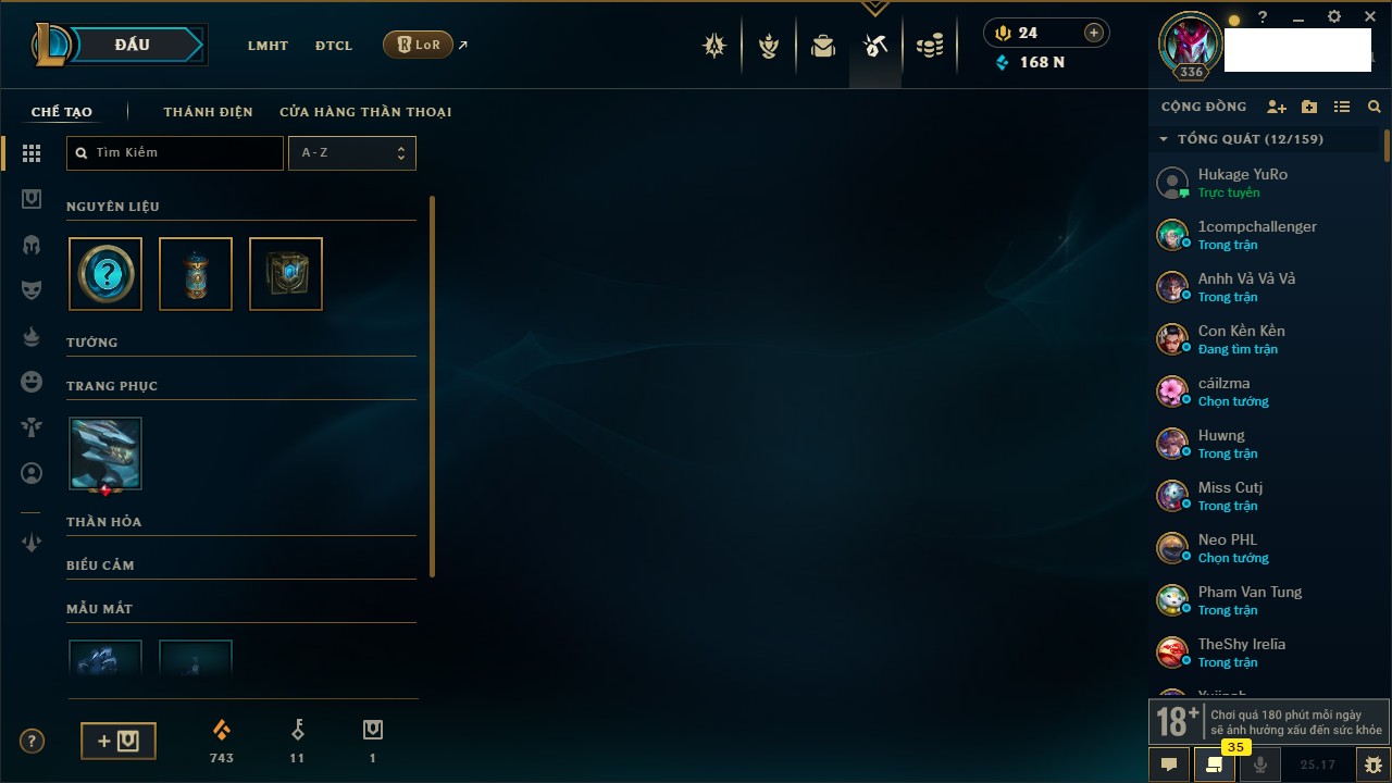 Rank Đơn: Sắt IVKhung: SắtTướng: 171 - Còn 231744 THXTrang Phục: 376Rank ĐTCL: Bạch Kim IILinh Thú: 120
