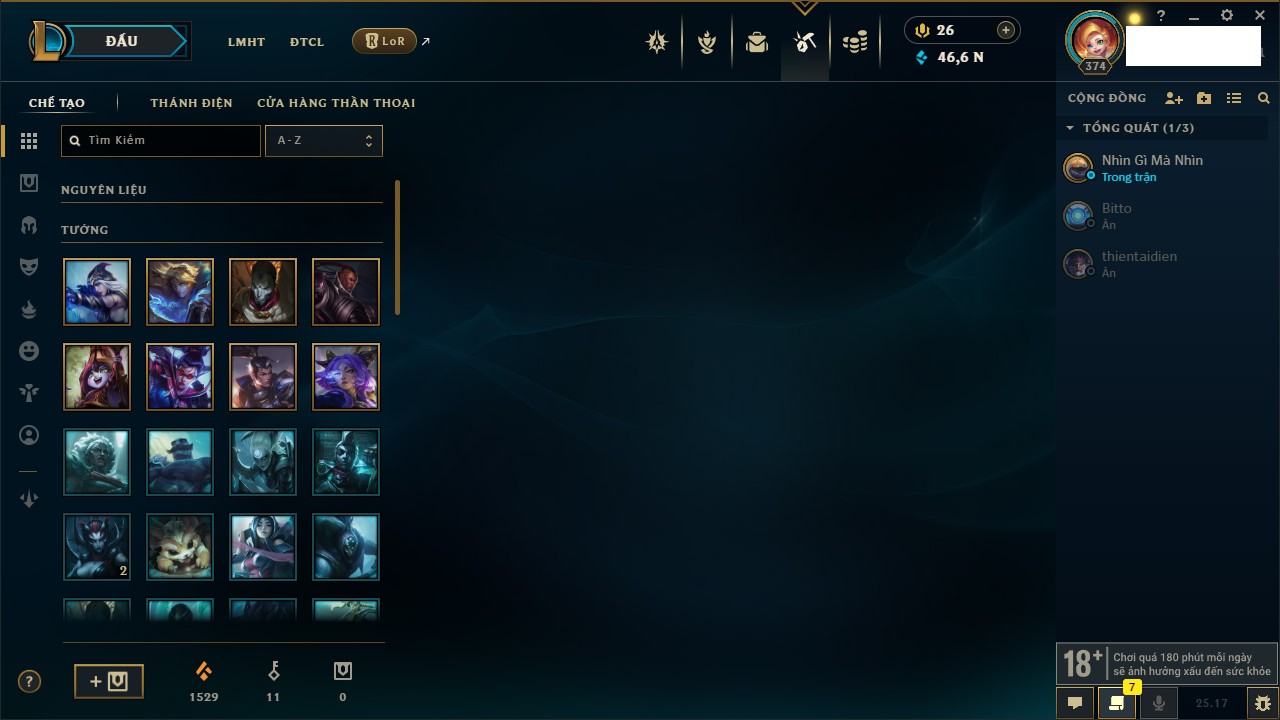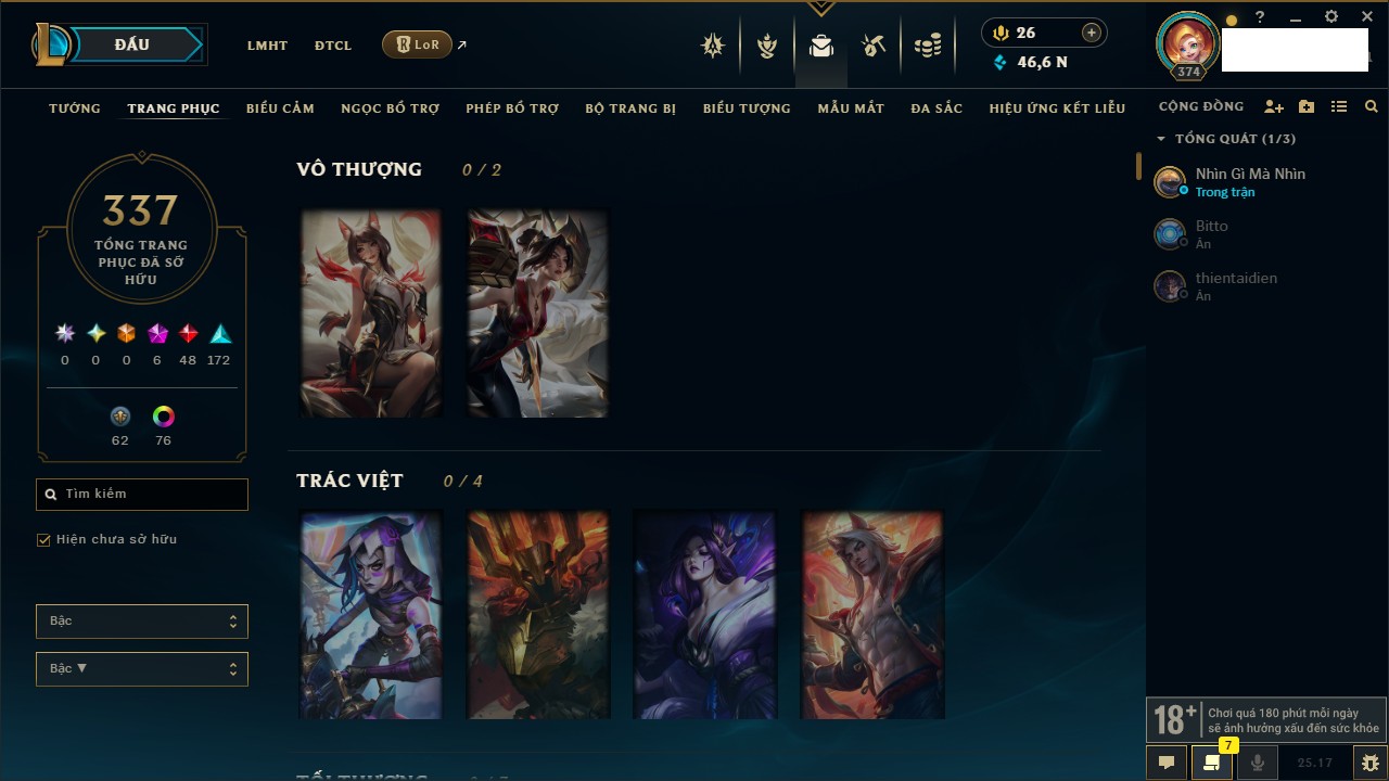 Rank Đơn: Vàng IVKhung: VàngTướng: 171 - Còn 175357 THXTrang Phục: 348Rank ĐTCL: Chưa RankLinh Thú: 46