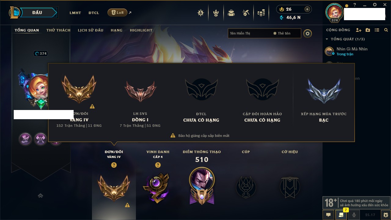 Rank Đơn: Vàng IKhung: Bạch kimTướng: 170 - Còn 212450 THXTrang Phục: 214Rank ĐTCL: Bạch Kim IVLinh Thú: 221