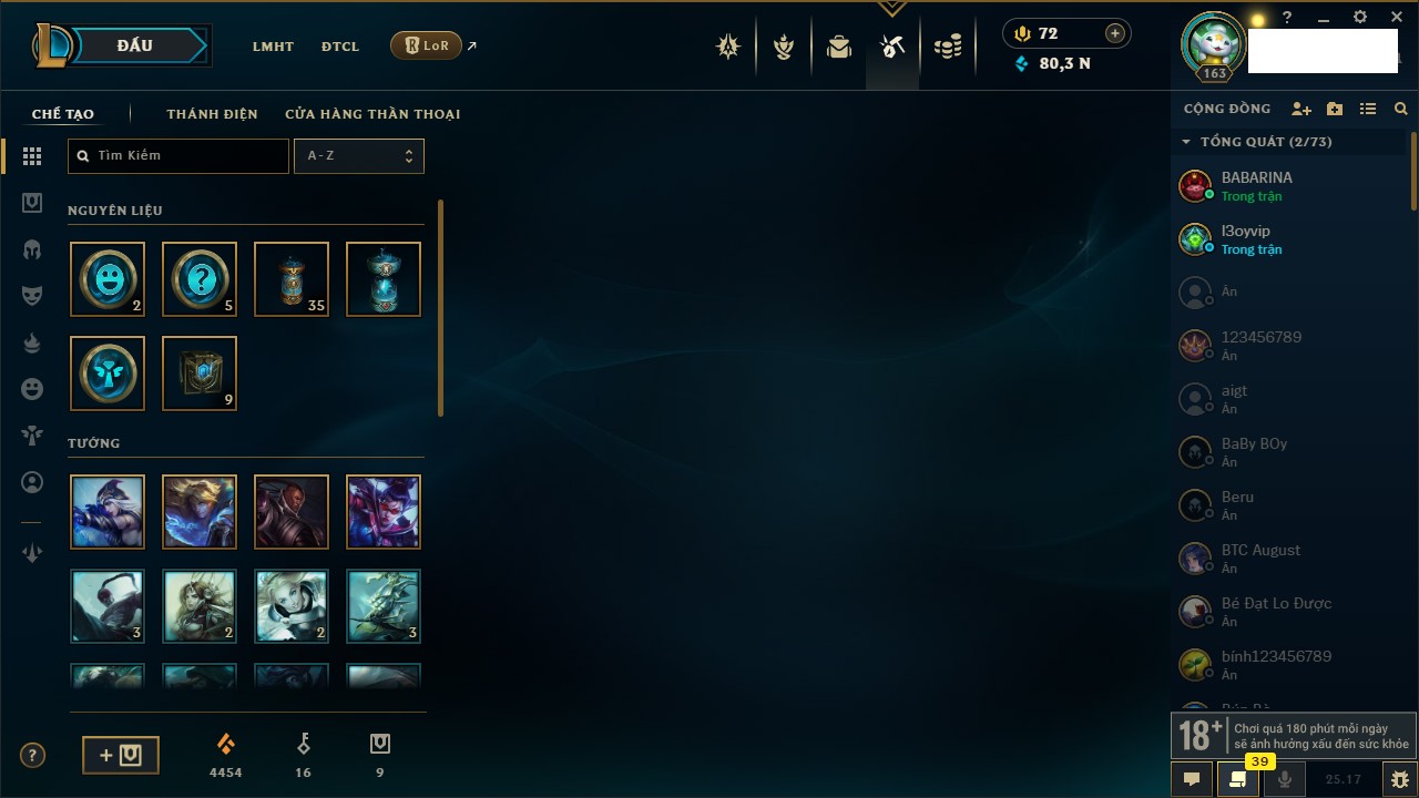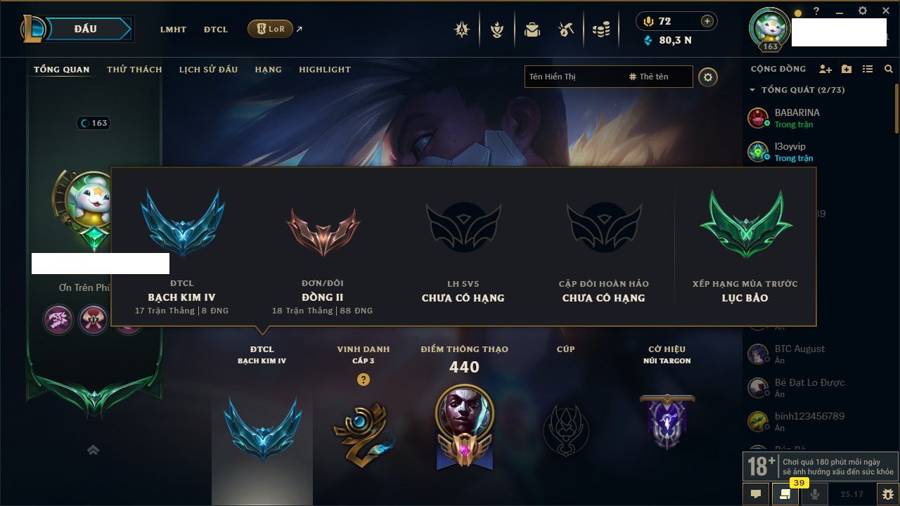 Rank Đơn: Lục Bảo IVKhung: VàngTướng: 171 - Còn 154648 THXTrang Phục: 203Rank ĐTCL: Bạch Kim IVLinh Thú: 69