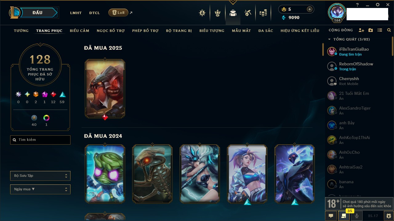 Rank Đơn: Bạch Kim IIKhung: Bạch kimTướng: 171 - Còn 316137 THXTrang Phục: 89Rank ĐTCL: Bạch Kim IIILinh Thú: 94