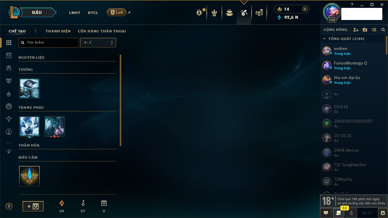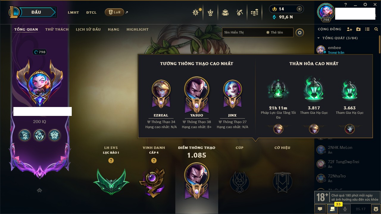 Rank Đơn: Chưa rank mùa nào Khung: Chưa có khung Tướng: 21 - Còn 3940 THX Trang Phục: 1 Rank ĐTCL: Chưa Rank Linh Thú: 89
