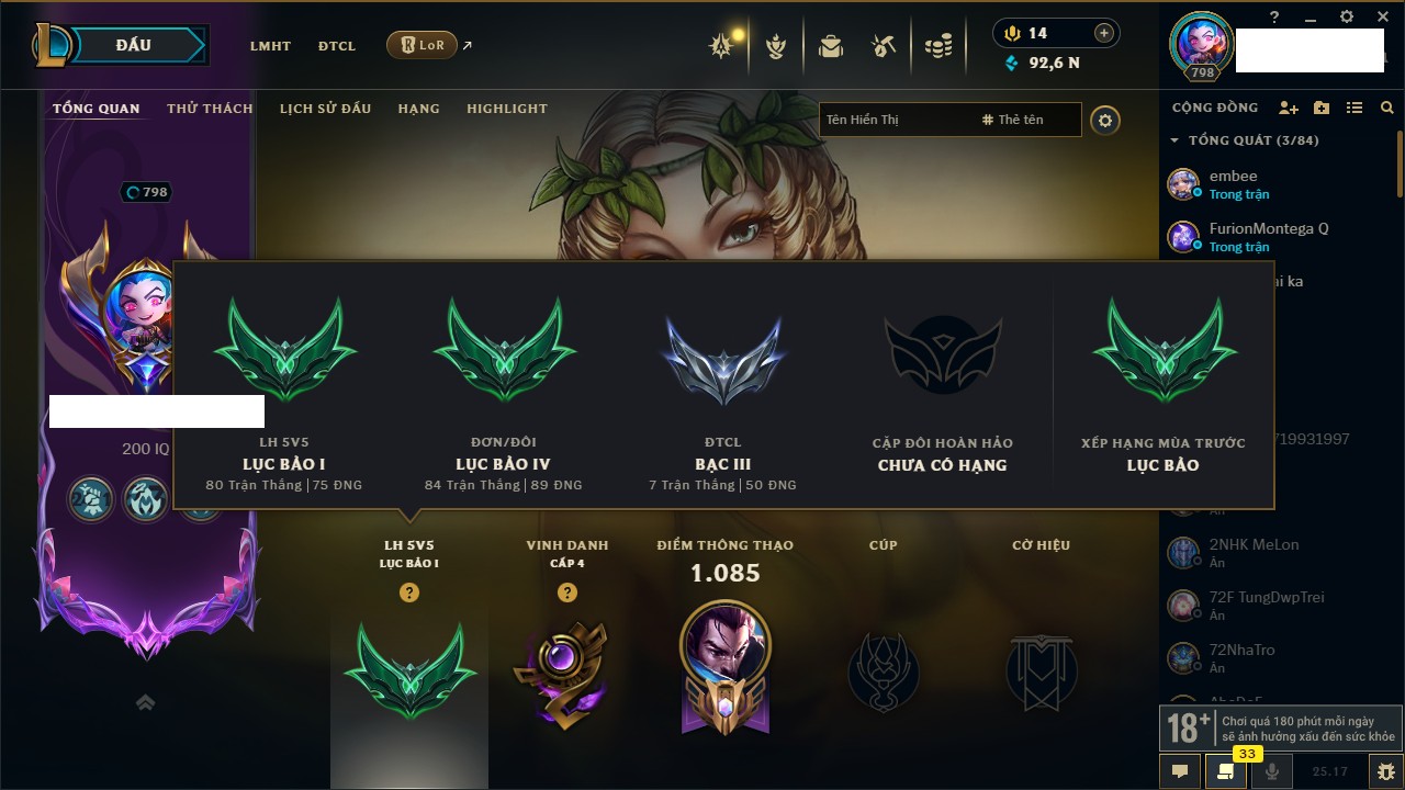 Rank Đơn: Lục Bảo IV Khung: Lục Bảo Tướng: 171 - Còn 92699 THX Trang Phục: 860 Rank ĐTCL: Bạc III Linh Thú: 255