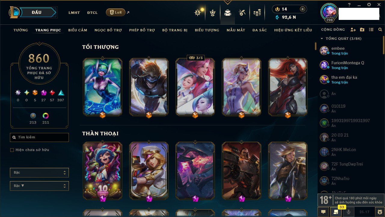 Rank Đơn: Chưa rank mùa nào Khung: Chưa có khung Tướng: 62 - Còn 5995 THX Trang Phục: 3 Rank ĐTCL: Chưa Rank Linh Thú: 107