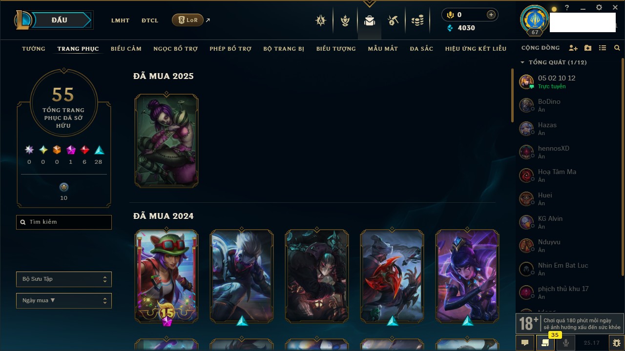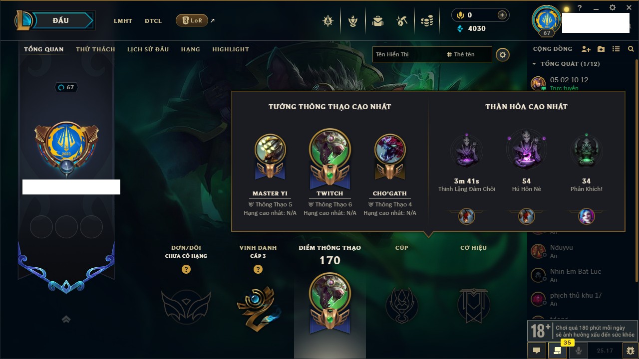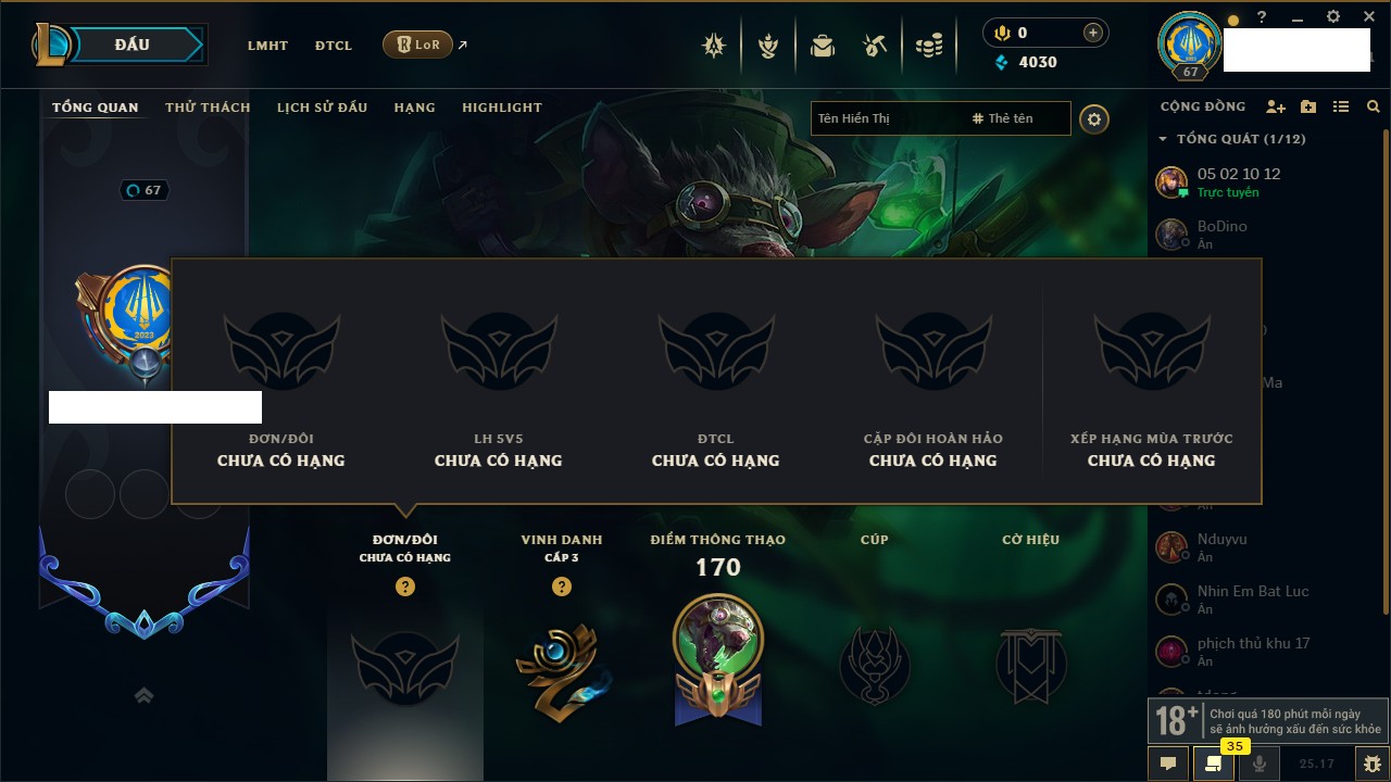 Rank Đơn: Bạc IIKhung: Chưa có khungTướng: 145 - Còn 12230 THXTrang Phục: 183Rank ĐTCL: Chưa RankLinh Thú: 71